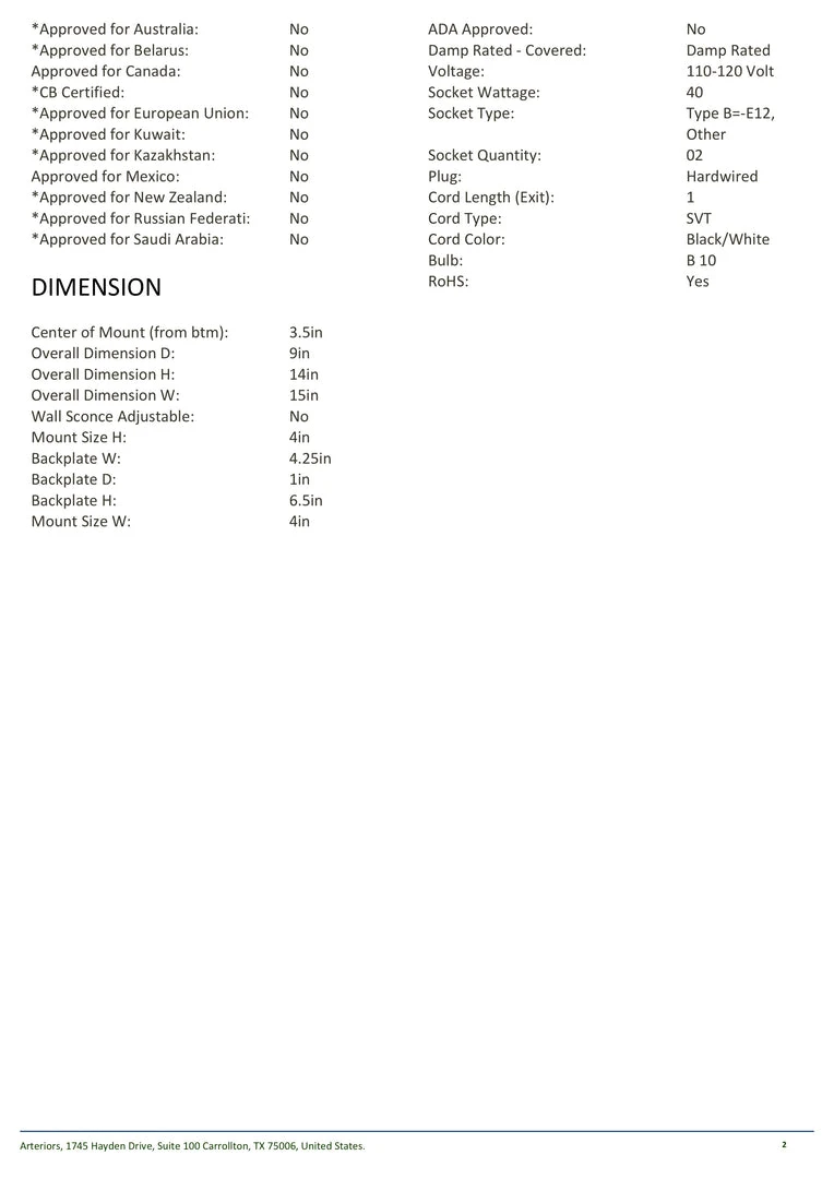| Materials | Glass; Steel; Damp Rated – Covered: Damp Rated; Socket Wattage:40; Socket Type: Type B=-E12 Other; Socket Quantity:02; Cord Length (Exit):1; Bulb:B 10 |