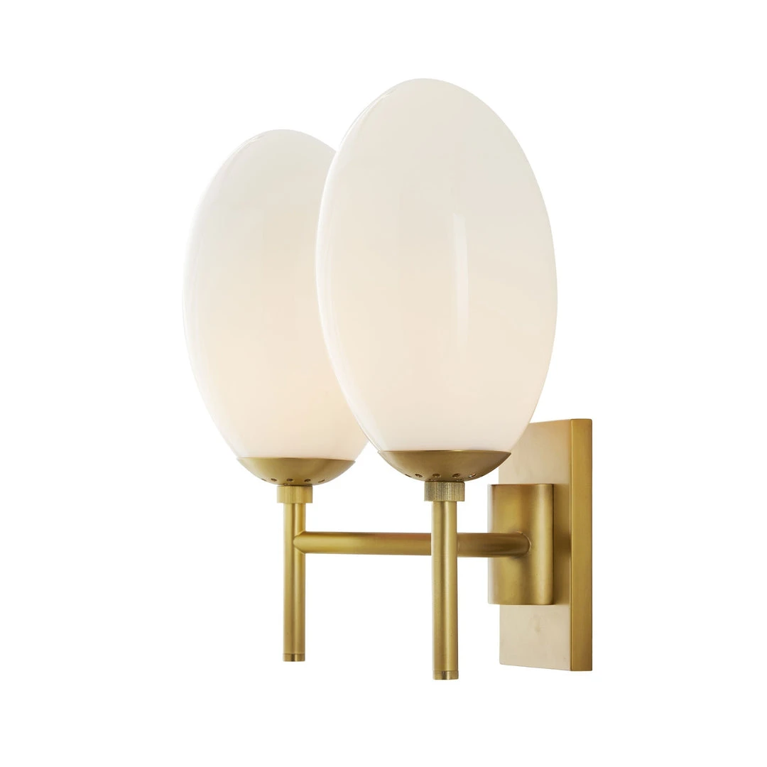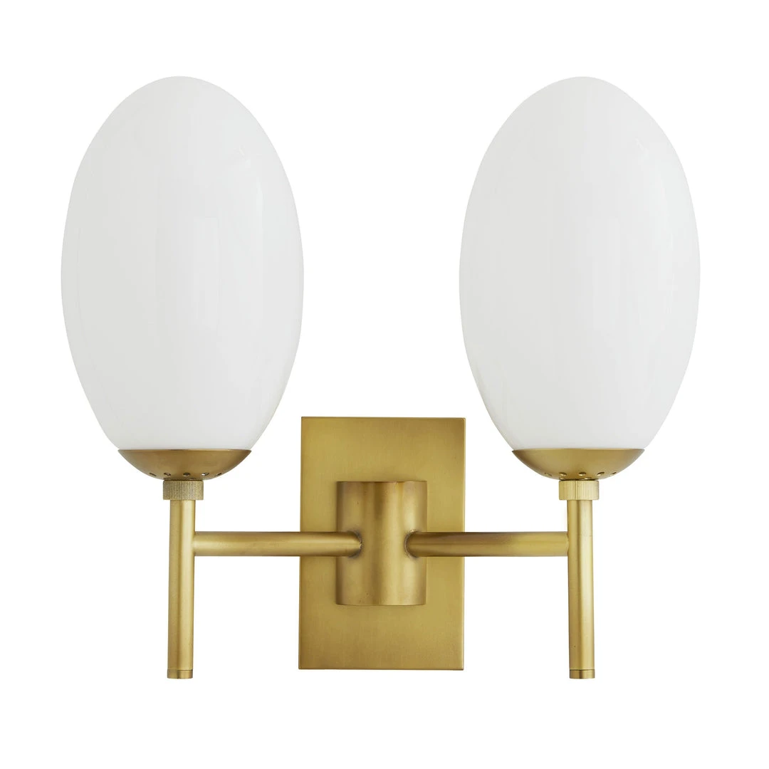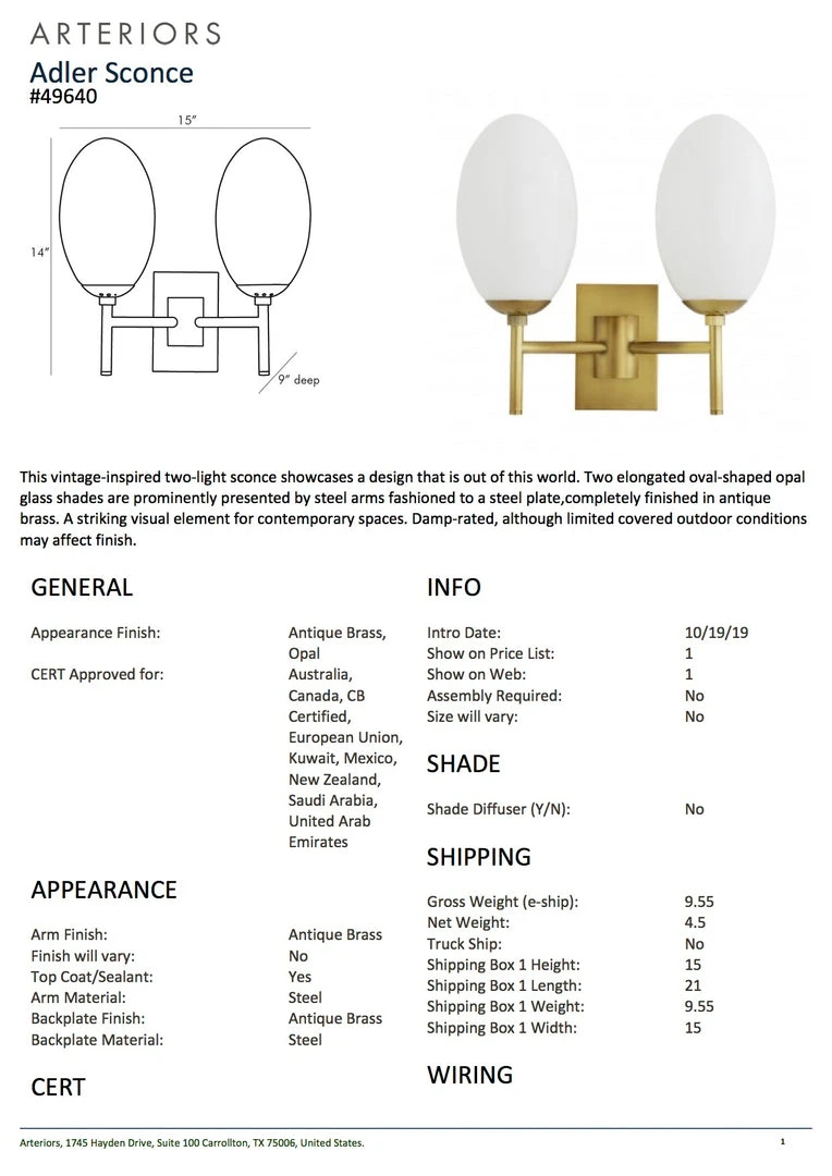 The vintage-inspired two-light Adler Sconce from Arteriors Home showcases a design that is out of this world. Two elongated oval-shaped opal glass shades are prominently presented by steel arms fashioned to a steel plate, completely finished in antique brass. A striking visual element for contemporary spaces. *Damp-rated, although limited covered outdoor conditions may affect the finish.