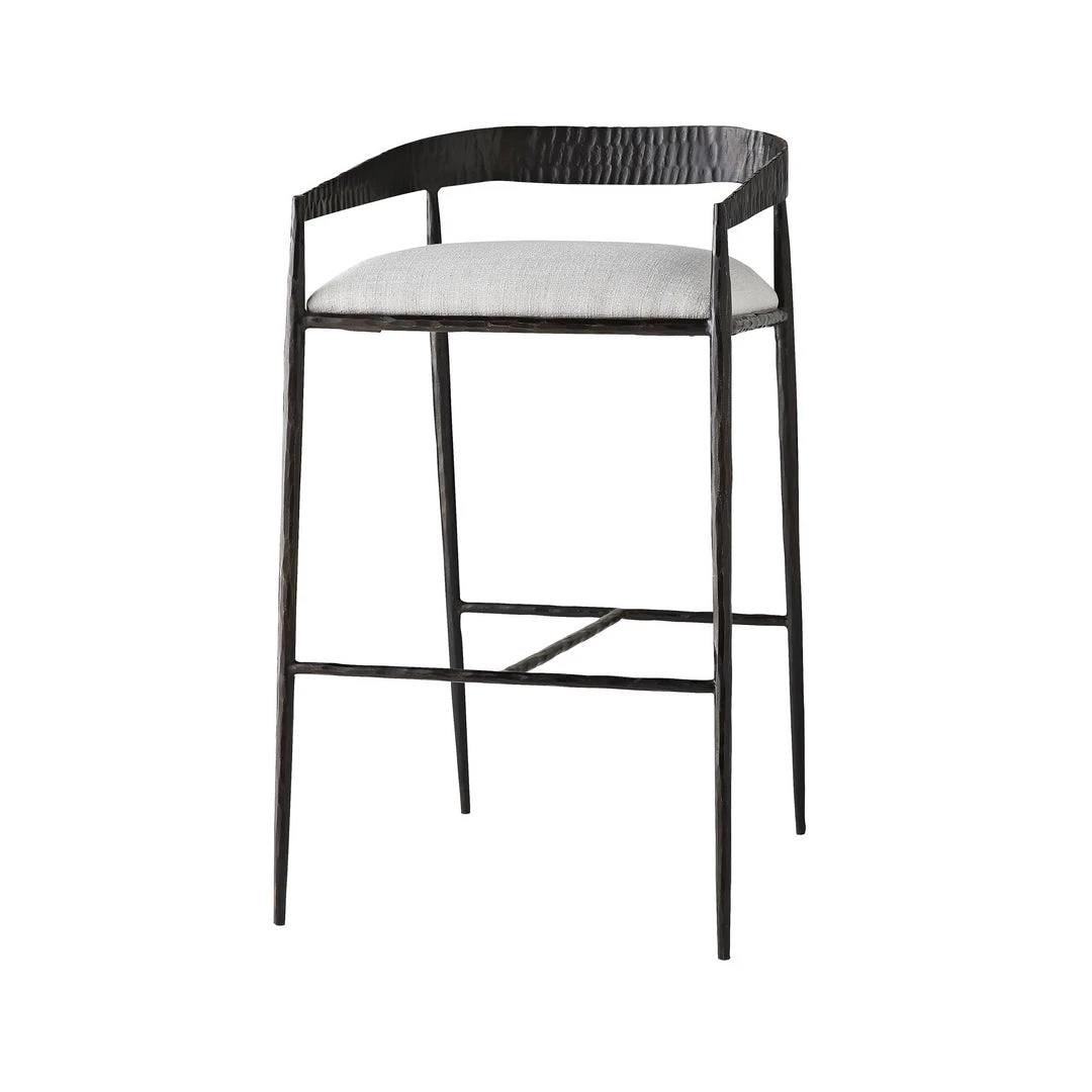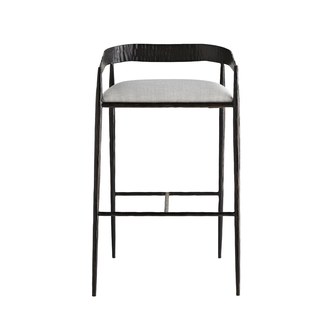 Sharp angles and an unrefined curvature define the bold aesthetic of the Ansel Bar Stool from Arteriors Home. Natural iron has been hammered by hand to create the rich impressions seen along the shallow back, while the hand-forged legs yield more delicate details. The seat is covered in sterling linen, elevating this versatile stool. *Also available as a counter stool.