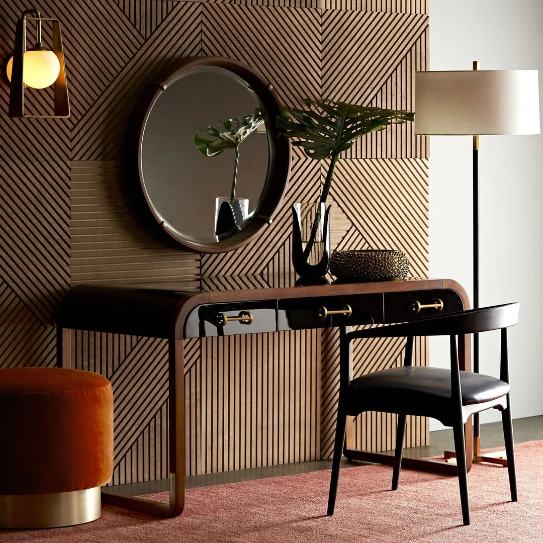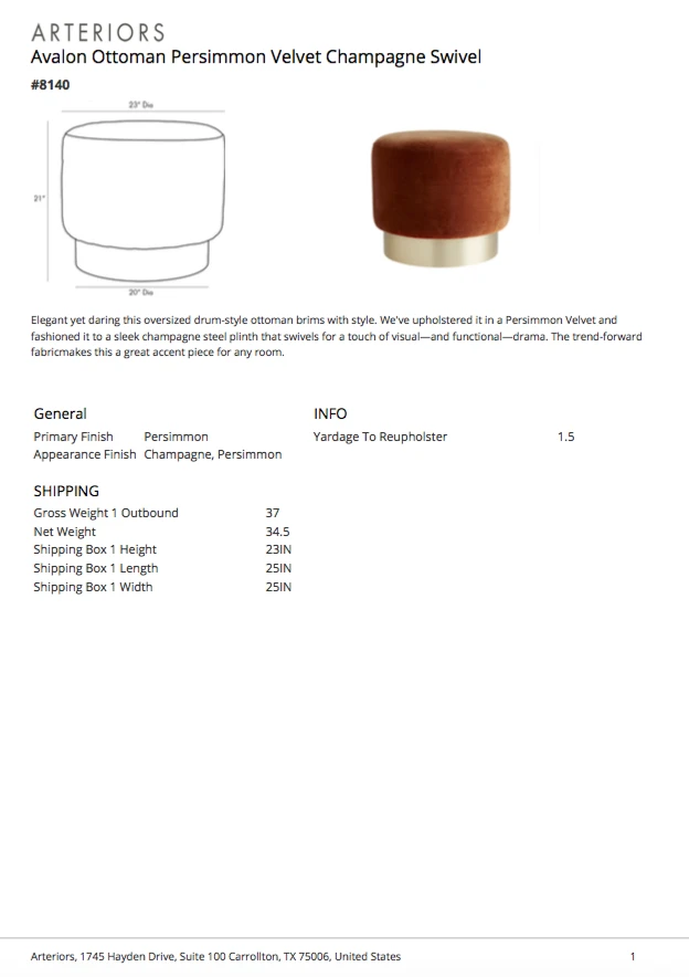 Elegant yet daring this oversized drum-style Avalon Ottoman in Persimmon Velvet from Arteriors Home brims with style. Upholstered it in a Persimmon Velvet and fashioned it to a sleek champagne steel plinth that swivels for a touch of visual, this piece is both functional and chic. The trend-forward fabric makes this a great accent piece for any room.
