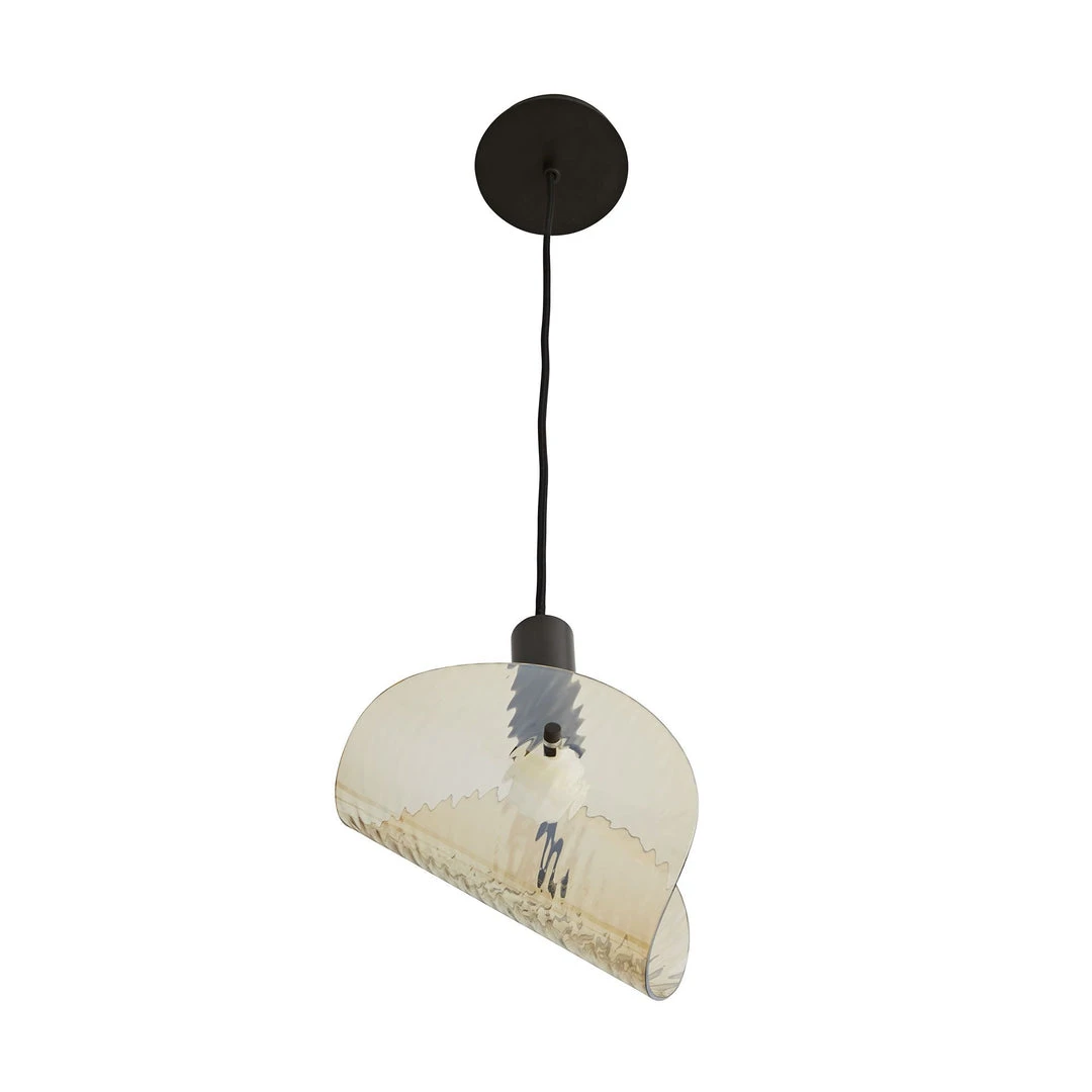 The Bend Pendant in Amber and Steel from Arteriors Home celebrates the subtle texture of hand-blown amber glass with a rippled shade and blackened steel accent that adds handcrafted appeal and warmth to its modern design, and careful composition of simple geometric forms. The streamlined, adjustable folded shade can be tipped to the preferred angle, and creates a dynamic effect when the pendant is hung in multiples with shades set at varying angles. Available in silvery-grey Smoke or warm Amber glass with antique brass or blackened steel metal, the pendant casts a warm, patterned glow.