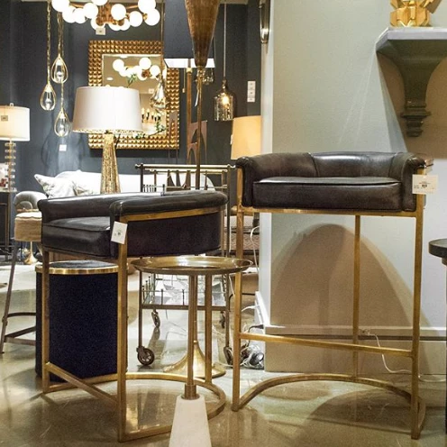 The Arteriors Home Calvin Counter Stool in Brindle top grain leather and antique brass finish is designed to slide under the kitchen counter when not in use due to its dropped back and arm height. Counter stools like the Calvin Counter Stool from Arteriors Home add a luxe elegance to modern, contemporary decor schemes.