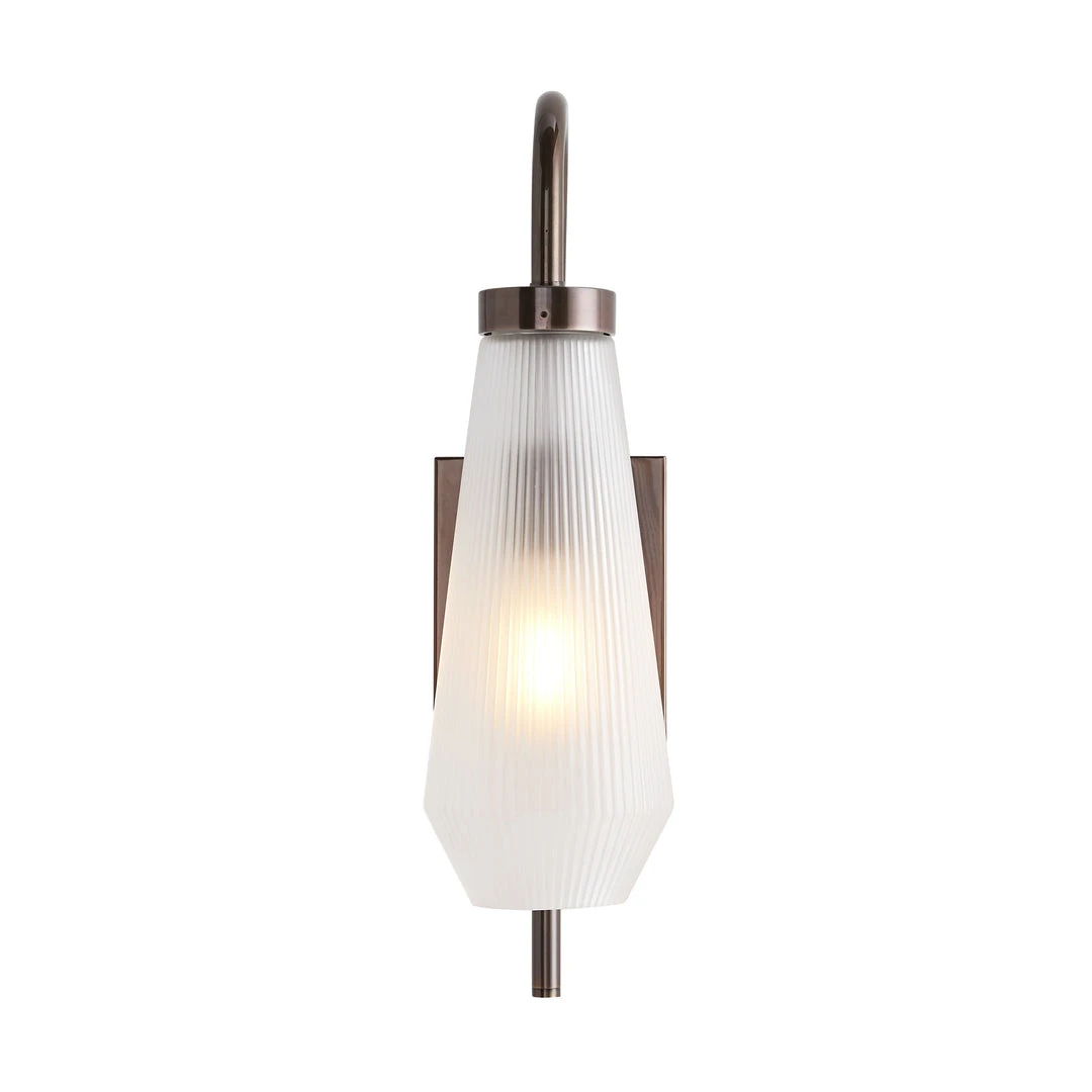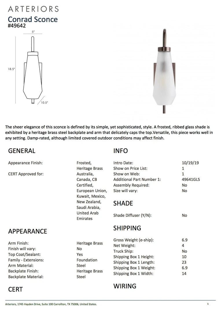 The sheer elegance of the Conrad Sconce in Heritage Brass from Arteriors Home is defined by its simple, yet sophisticated style. A frosted, ribbed glass shade is exhibited by a heritage brass steel backplate and arm that delicately caps the top. Ultra-versatile, this piece works well in any setting. *Damp-rated, although limited covered outdoor conditions may affect finish.