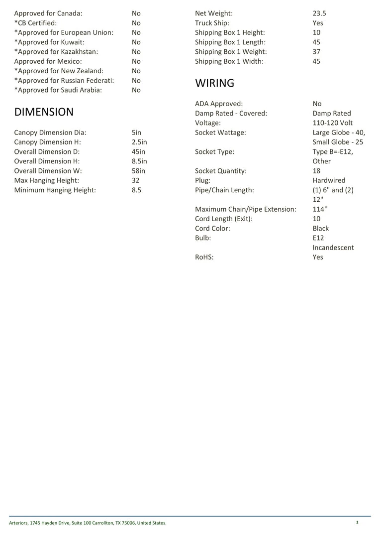 | Materials | Brown Nickel Finish; Adjustable Arms; 18 Light; Bulbs Not Included |