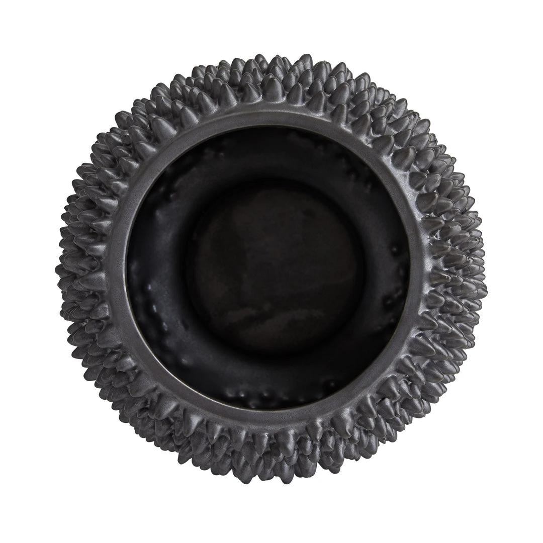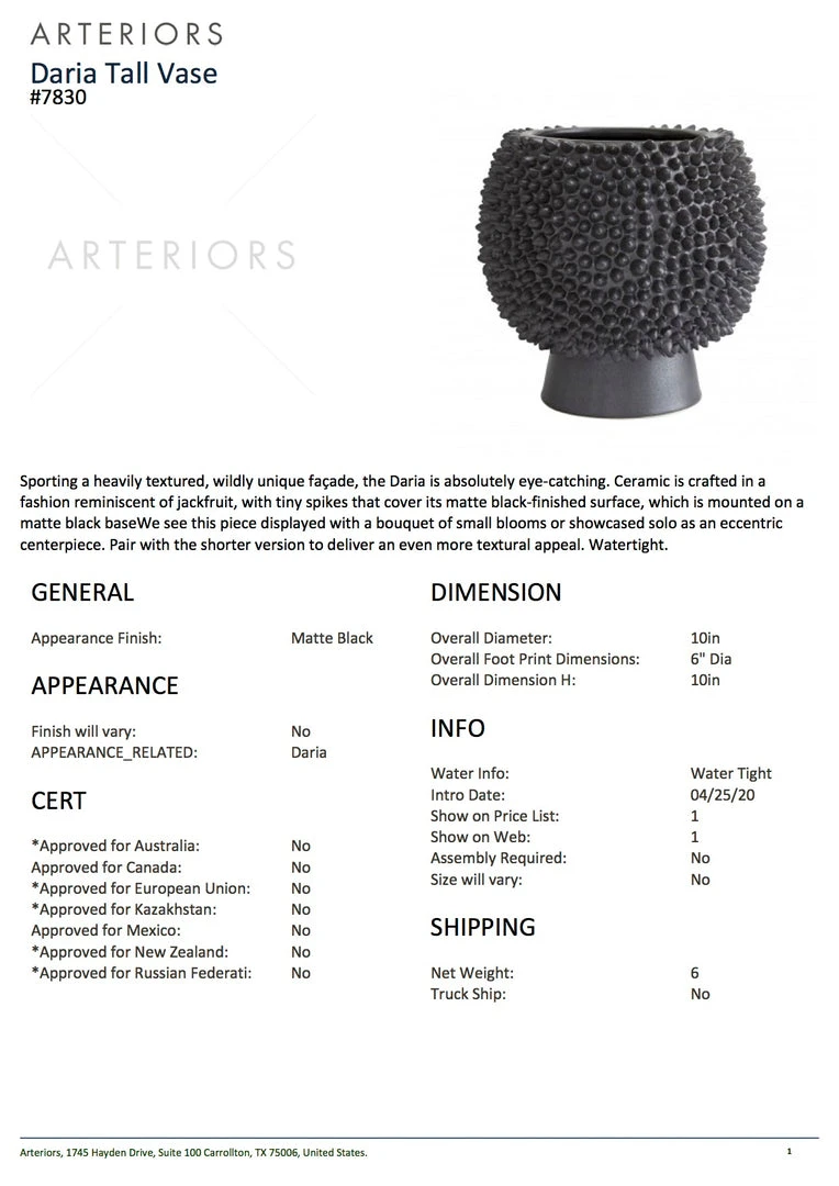 Sporting a heavily textured, wildly unique façade, the Daria Tall Vase in Matte Black from Arteriors Home is absolutely eye-catching. Ceramic is crafted in a fashion reminiscent of jackfruit, with tiny spikes that cover its matte black-finished surface, which is mounted on a matte black base. Display this striking piece with a bouquet of small blooms or showcased solo as an eccentric centerpiece. Pair with the shorter version to deliver an even more textural appeal. *Watertight.
