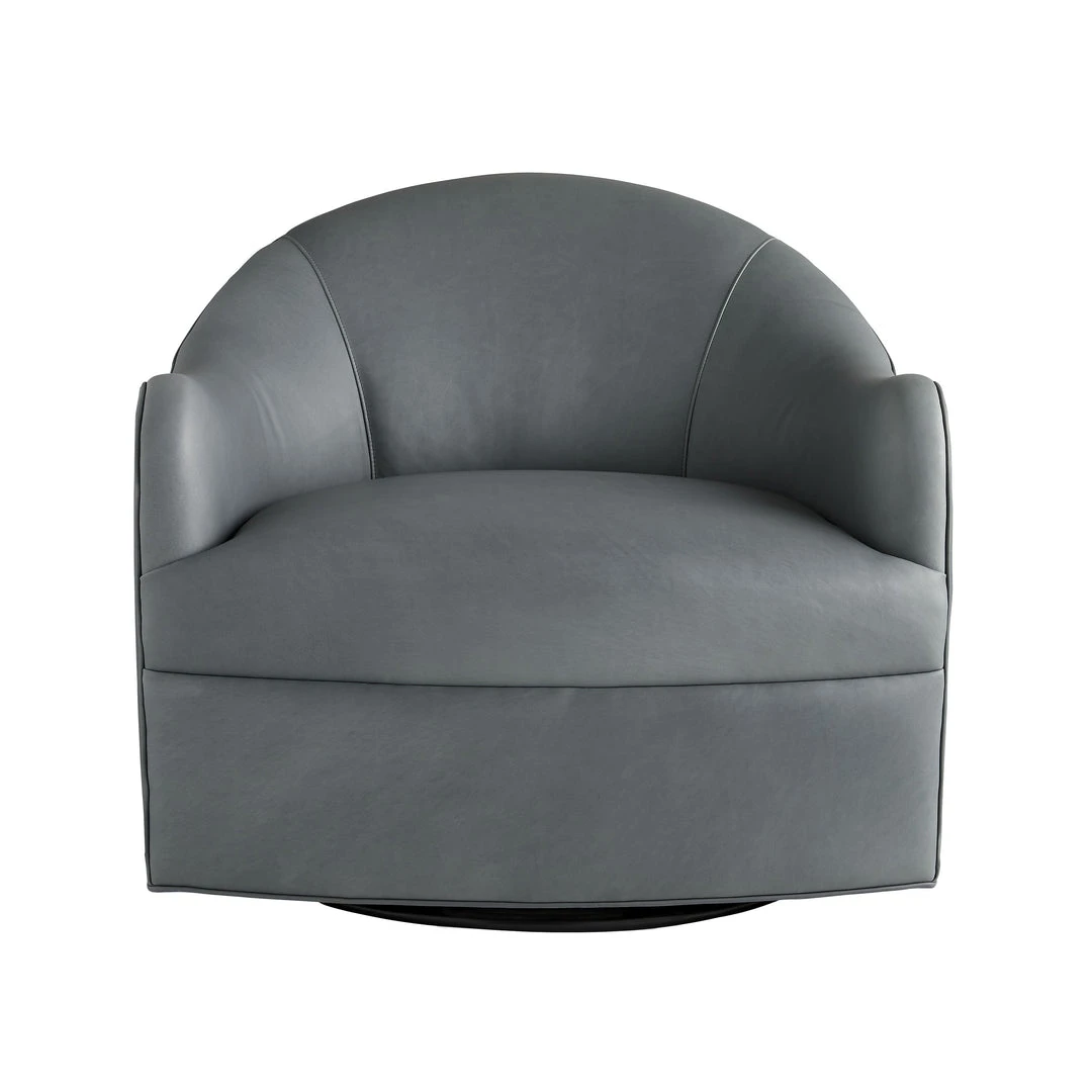 Delve into the depths of comfort with this luxe Delfino Chair Grey Leather Swivel from Arteriors Home. The deep seat and barrel back are comfortable and inviting, while the large-scale size provides an elevated level of comfort that is hard to resist. Upholstered in top-grain leather, this tub-style chair rests atop a blackened iron swivel base that is neatly concealed from view. Look to place this piece in your favorite entertaining space next to a drink table, or pair with another to create a cozy environment.