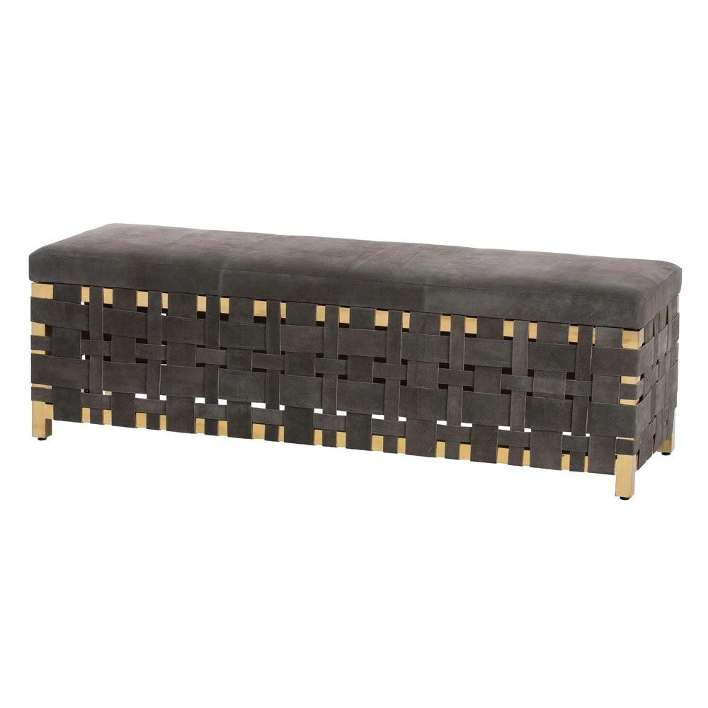 The Arteriors Home Elis Bench, a Windsor Smith design, showcases moss gray suede bands handwoven into a simple basket weave pattern that is stretched around a sleek, polished brass frame. Benches like the Elis. with its luxurious padded bench top is both a statement piece and practical seating! Influenced by equestrian culture and the juxtaposition of the materials, this modern bench from Arteriors offers texture and sophisticated style to any room.