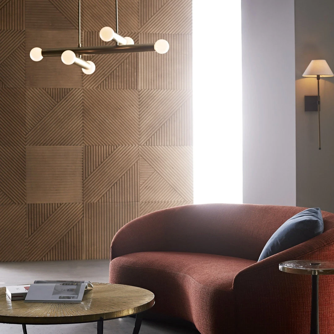 Minimalistic and modern, the silhouette of the Emerson Chandelier from Arteriors Home is timeless. Two tubes sit on opposing sides of a linear iron frame, allowing the light to be angled from the top and bottom planes of its straightforward surface. Completely finished in antique brass, each tube houses two large globe bulbs, creating an extra element of shine. Versatility allows it to function as an installation for public spaces when hung in multiples in a tiered fashion. *Additional pipe available (PIPE-463).