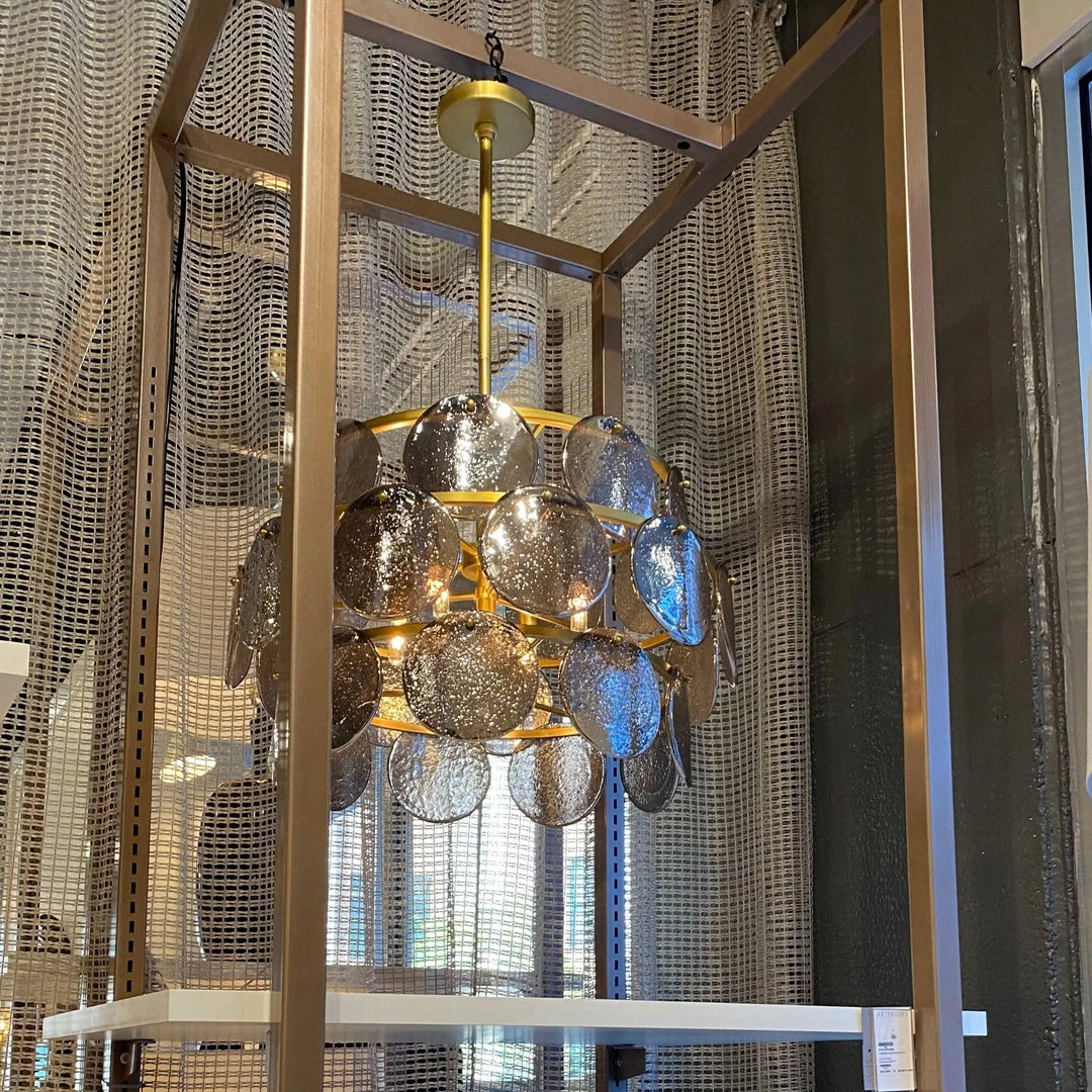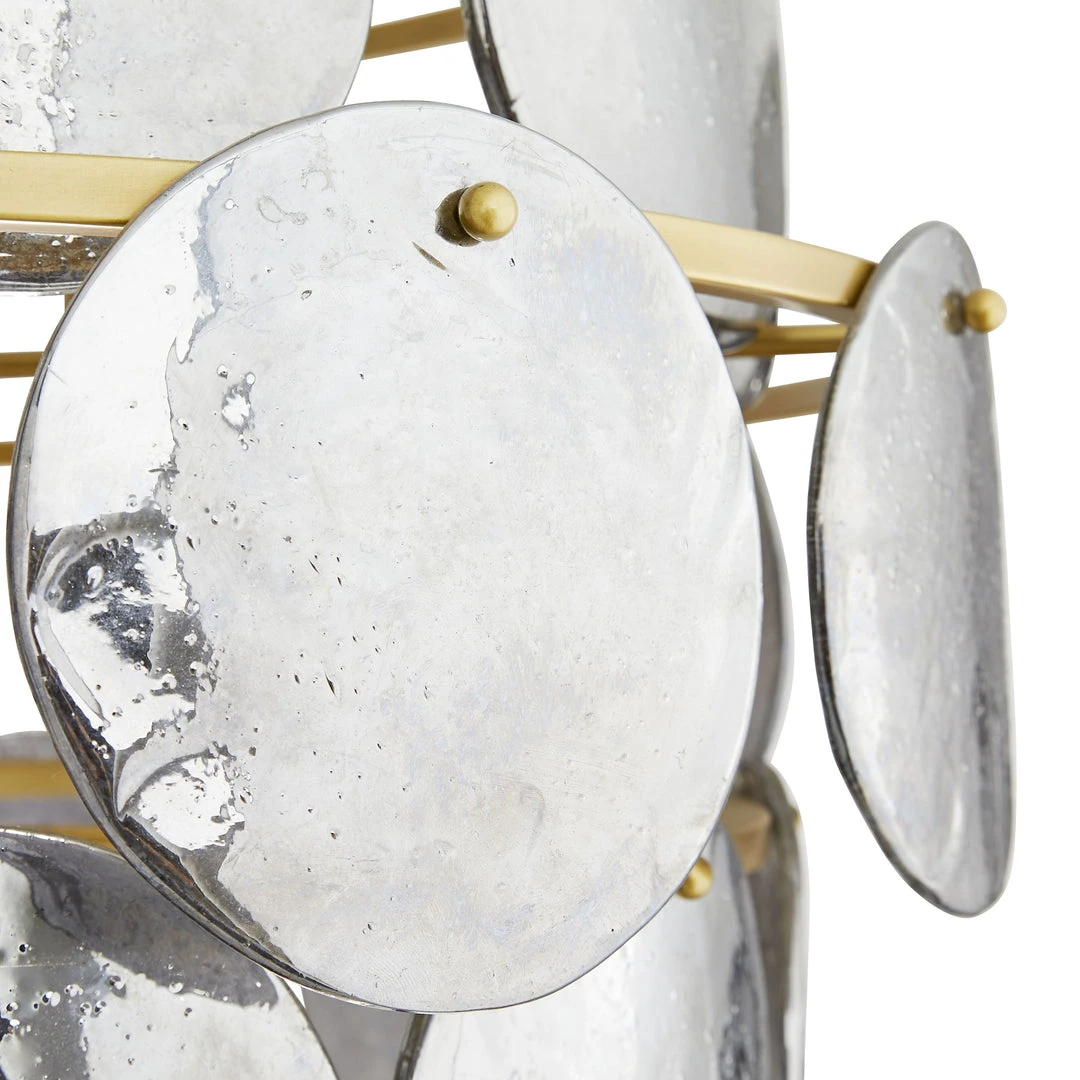 Arteriors Home showcases the Evelyn Chandelier, offering a striking statement light for your home. Large, circular slumped seedy glass panels in a smoke finish are fastened to a tiered, concentric antique brass steel frame that suspends from a matching sleek steel pipe. When lit, the light delivers a soft sheen to the glass’s moody hue, further enhancing its natural composition. Perfect for adding a touch of drama and a lot of luster to space. *Finish may vary.