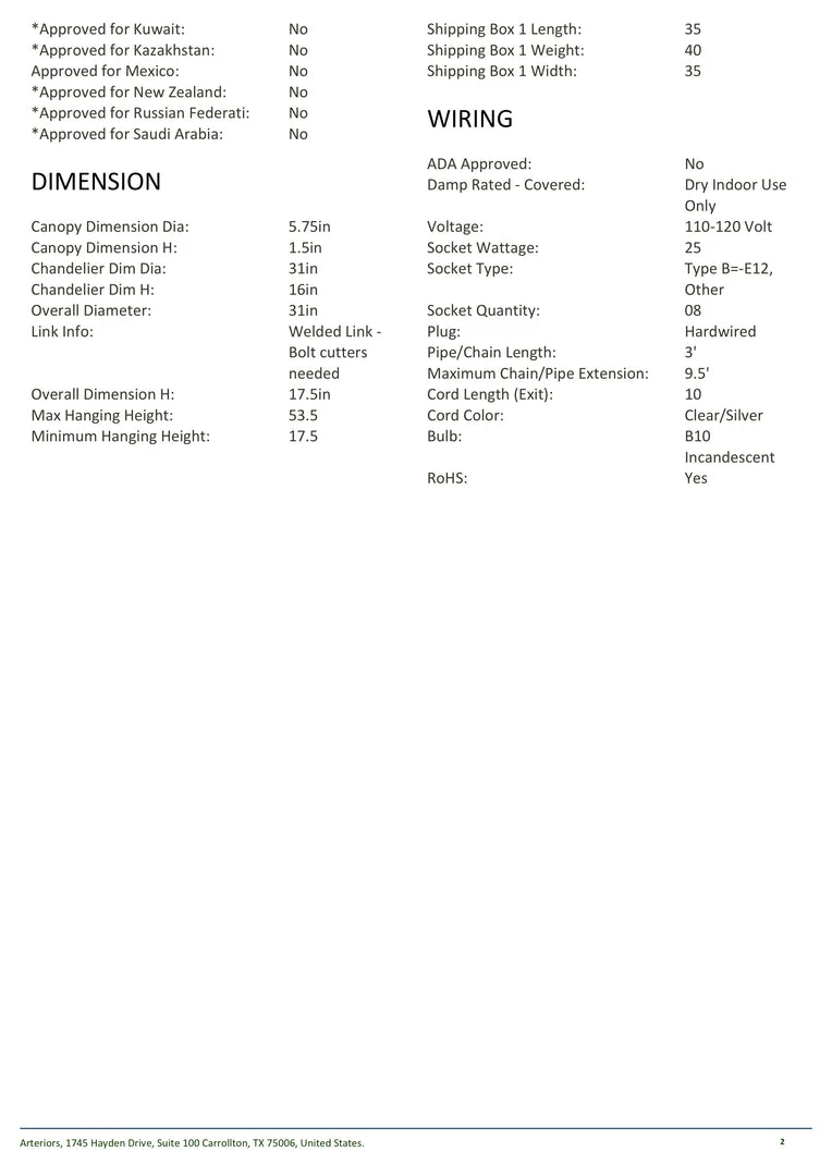 | Materials | Iron; Gold Leaf; 3 ft. chain; (8) 25 watt bulb |