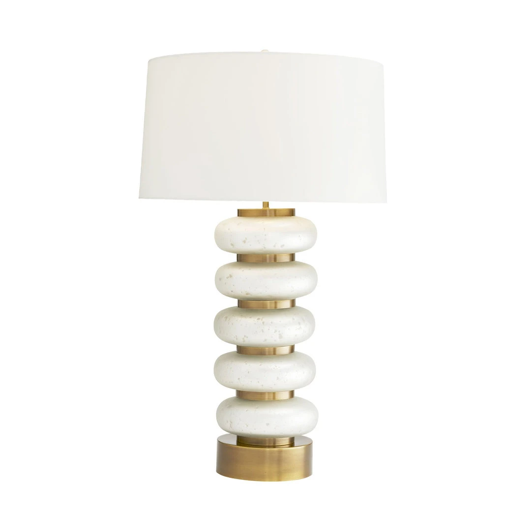 The traditional stacked design of the Gaelen Lamp from Arteriors Home gets an organic, modern update. An antique brass foundation presents stacked mercury glass that perfectly circumnavigates its frame, breaking between pieces to expose the underlying sheen. Each glass ring features a frosted finish to lend a textural element that enhances the overall aesthetic. A great addition to a bedside table. Topped with an off-white linen drum shade with off-white cotton lining and an acrylic sphere with an antique brass finial. *Finish will vary