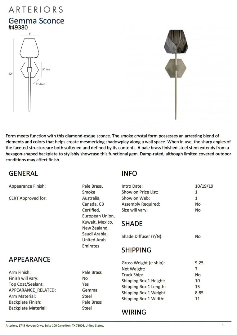 Form meets function with the diamond-esque Gemma Sconce in Smoke from Arteriors Home. The smoke crystal form captivates the eye with an arresting blend of elements and colors that helps create a mesmerizing shadowplay. When illuminated, the sharp angles of the faceted structure are both softened and defined by its contents. A pale brass-finished steel stem extends from a hexagon-shaped backplate to stylishly showcase this functional gem. Damp-rated, although limited covered outdoor conditions may affect the finish.