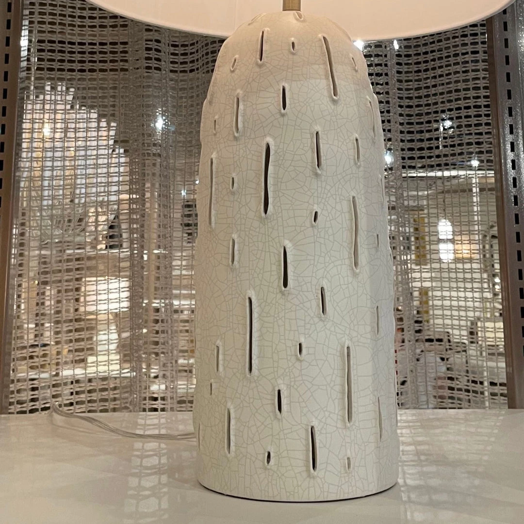 The Grotto Lamp from Arteriors Home goes against the grain of traditional lighting. Hand-carved cutouts greet the ceramic foundation to create an unconventional façade full of organic textures and unrefined apertures. A white-stained crackle finish beautifully breaks against the ceramic, pulling at the edges of each cutout and further enhancing its askew aesthetic. Topped with a pewter microfiber drum shade with off-white cotton lining and an antique brass sphere finial. *Finish will vary.