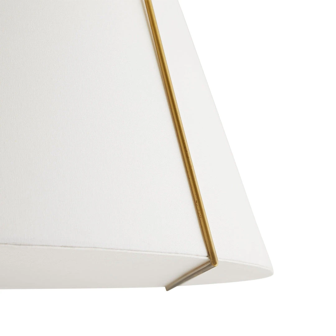 Finding a balance between modern and traditional elements, the Heloise Pendant in Antique Brass from Arteriors Home creates architectural interest. A classic conical white linen shade is suspended within an antique brass steel frame to contemporize the look. When in use, the iron detail on the bottom of the shade plays on its architectonic appeal by creating an interesting lightscape. We see this hung in multiples over a kitchen island or breakfast nook table. Additional pipe available (PIPE-422). Damp-rated, though limited outdoor conditions may affect the finish.