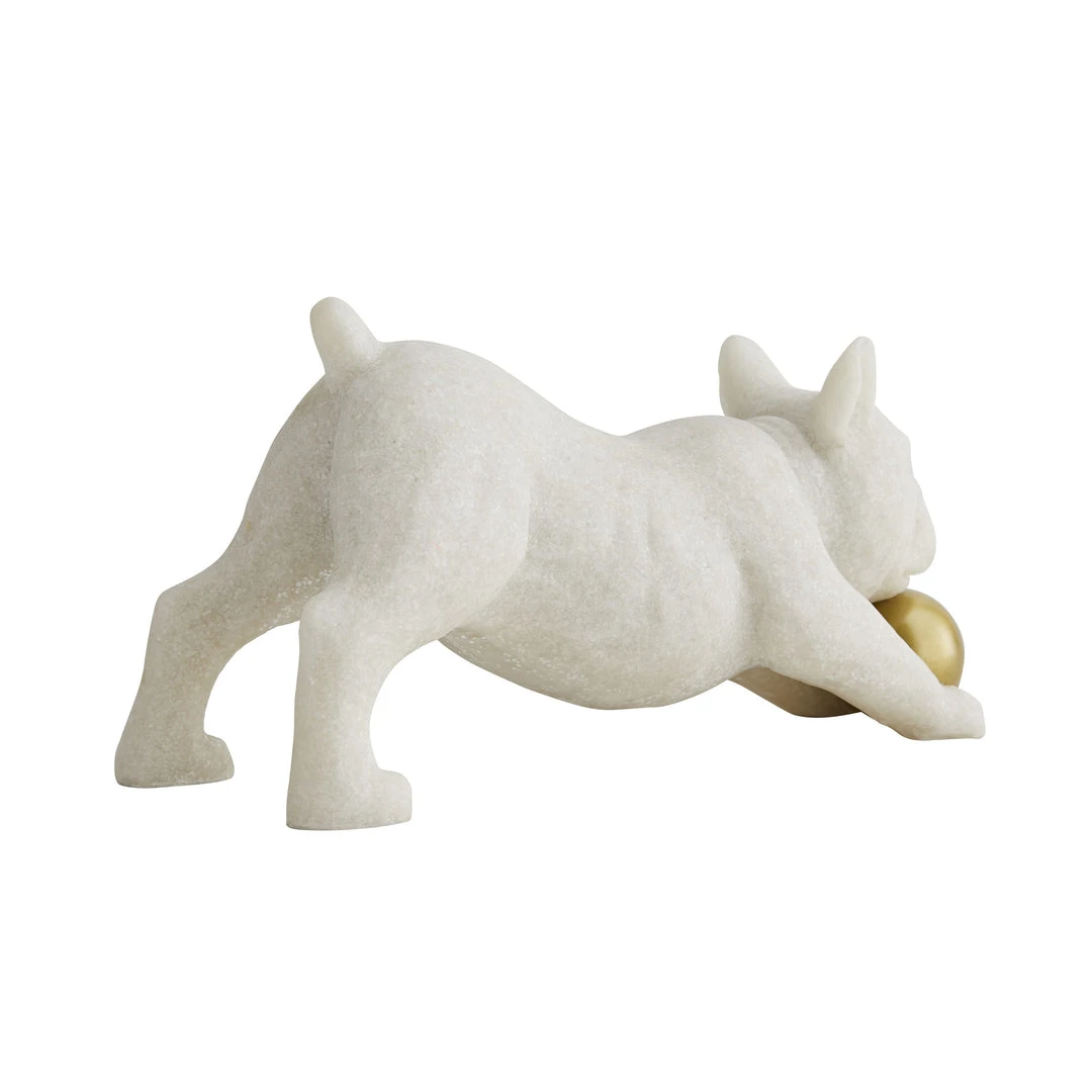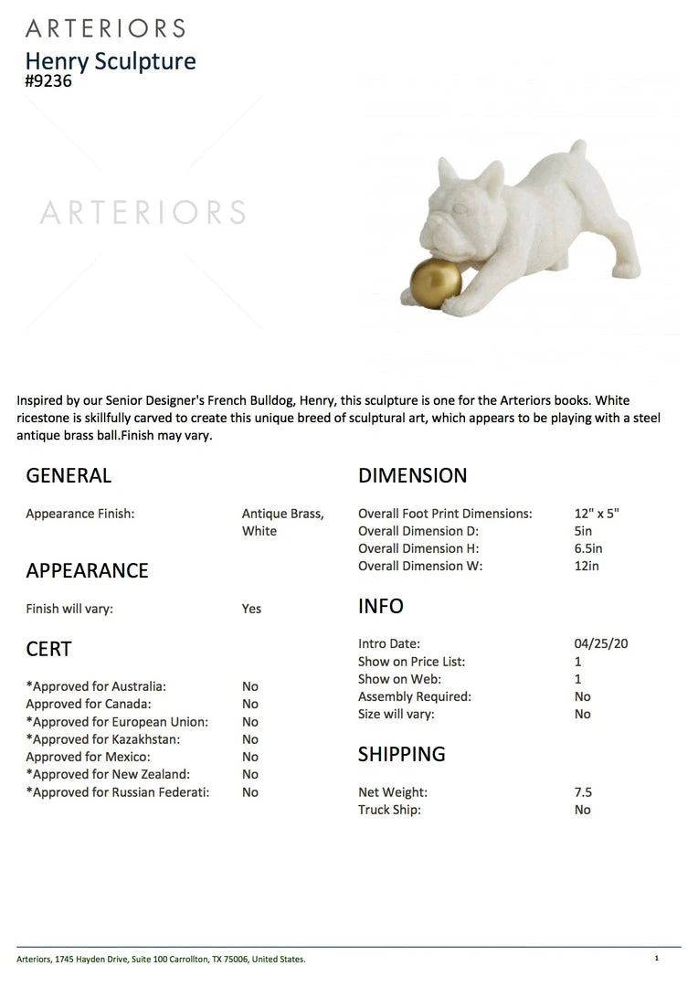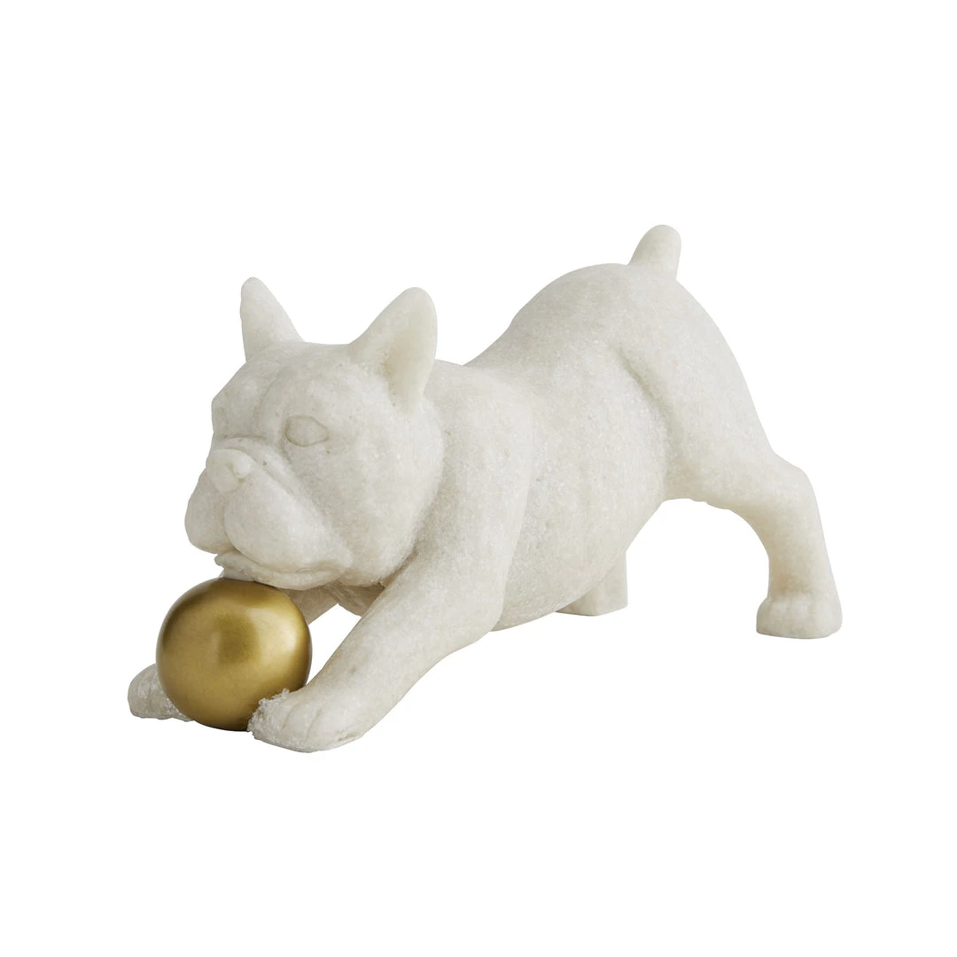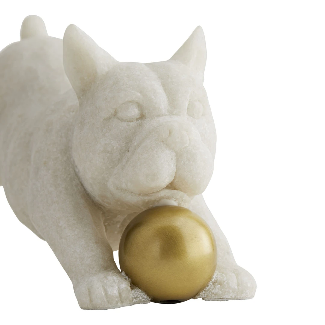 Inspired by the beloved French Bulldog, the Henry Sculpture from Arteriors Home delivers a chic nod to the quirky and endearing. White ricestone is skillfully carved to create this unique breed of sculptural art, which appears to be playing with a steel antique brass ball. The henry is the perfect piece to add whimsy to bookshelves, consoles, and tabletops alike. *Finish may vary.