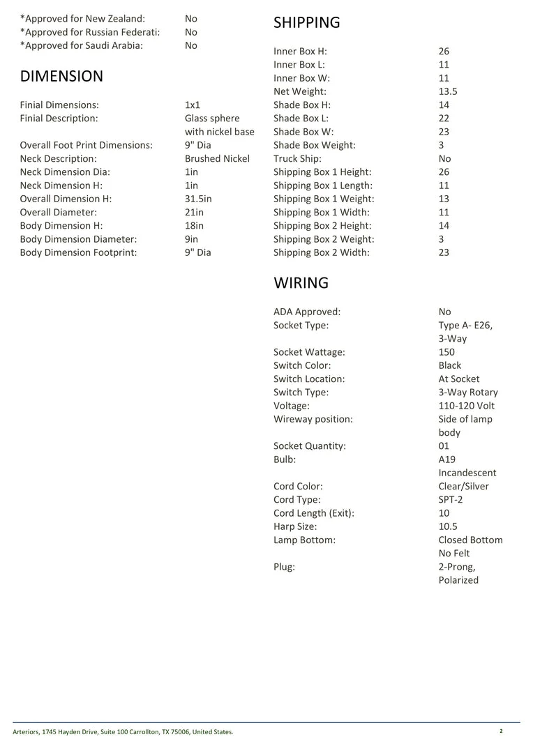 | Materials | Ceramic; Off-White Linen Shade; (1) 150 Watt Bulb |
