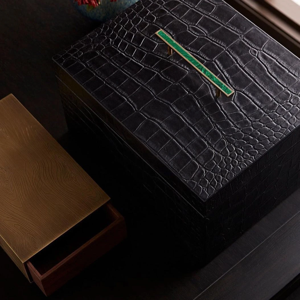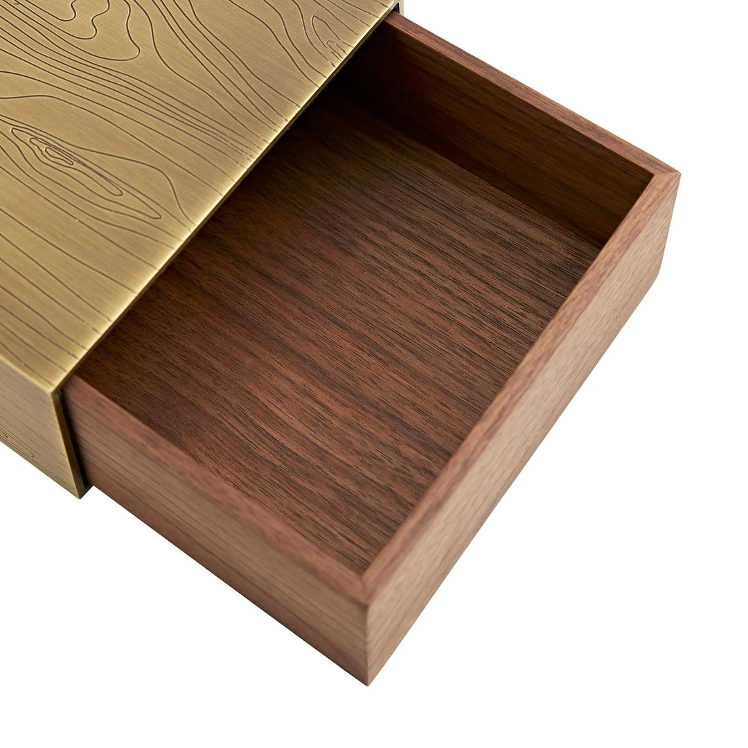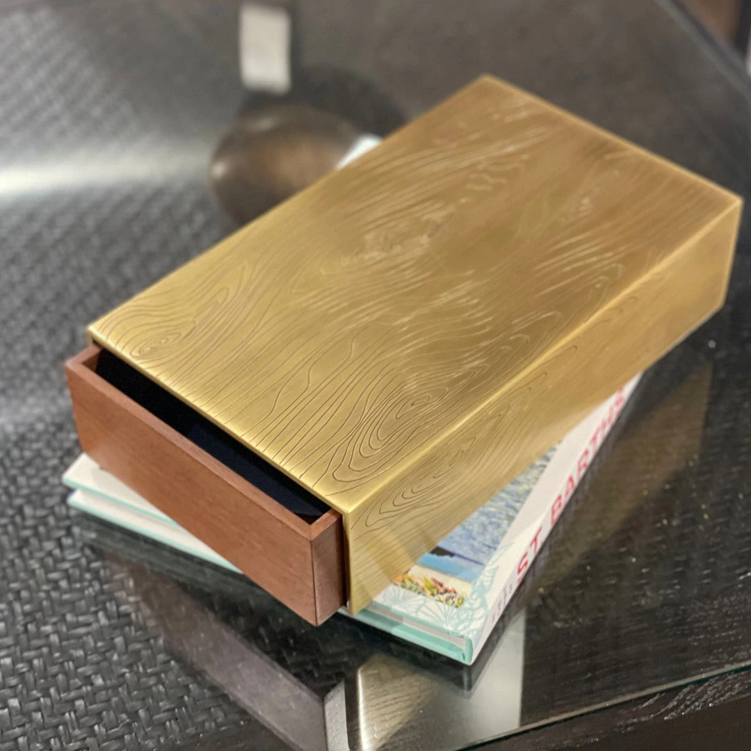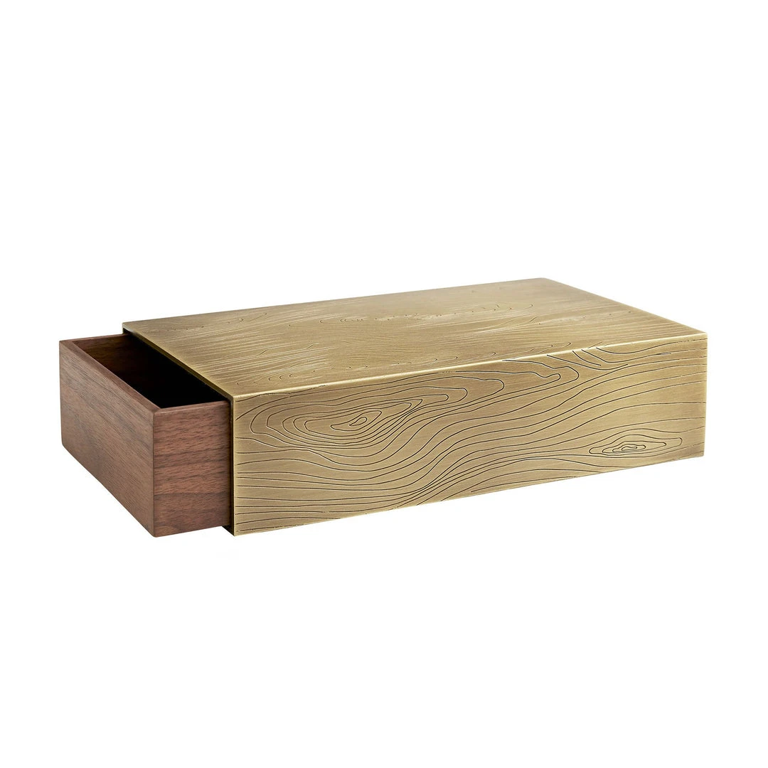 Inspired by the straightforward profile and cuboid shape of a vintage matchbox, the Hopkins Box from Arteriors Home strikes at the right angles when it comes to designer storage. A solid walnut drawer covered in antique brass features a faux-bois etching that delivers a textured element while concealing contents. *Finish will vary.