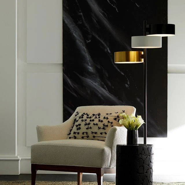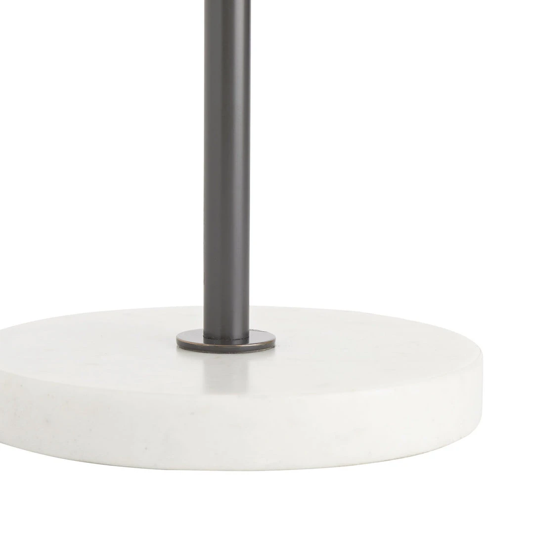 The Hutton Floor Lamp from Arteriors Home is ultra-contemporary with the right touch of luxe. A simple frame presents three shades in differing finishes on antique brass, white, and bronze, each staggered for optimal light. The bronze-finished steel foundation seamlessly flows into a circular white marble base to effortlessly elevate its straightforward design. *Marble will vary.