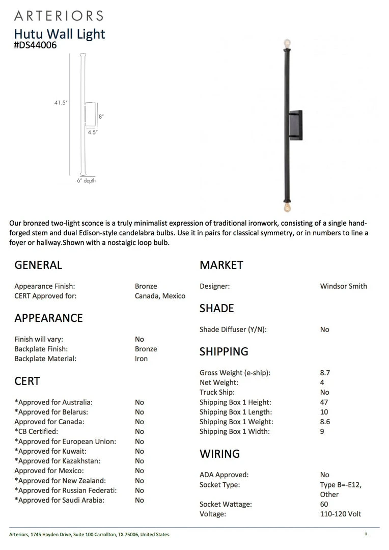 Arteriors Home Hutu Wall Light, designed by Windsor Smith, is a skillfully bronzed, two light sconce. Wall sconce lighting like the Hutu is the prime example of a minimalist expression on traditional ironwork. This rustic wall sconce lighting consists of a single hand forged stem and dual Edison style candelabra bulbs. Arteriors ensures that old will meet new when pairing its classical symmetry with any foyer or hallway. Wall sconce lights like this one can be used as living room wall sconce lighting. *Shown with a nostalgic loop bulb.