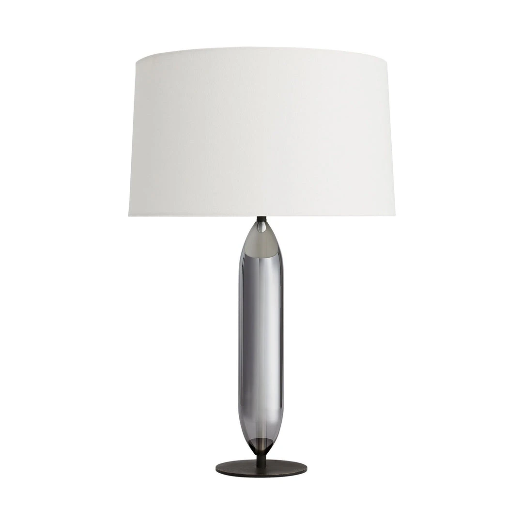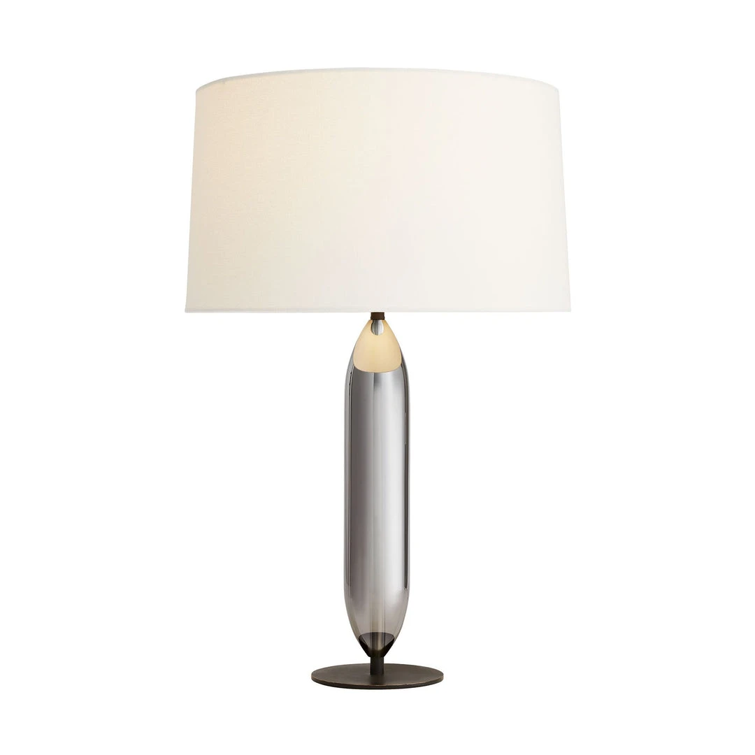 The capsule-inspired shape of the Irene Table Lamp from Arteriors Home presents an artistic architectural appeal that is equally matched with a contemporary smoke luster finish. A thin, circular bronze steel base brings a matte contrast to the high-sheen gloss. When illuminated, a range of moody tones becomes more visible. Topped with an off-white linen drum shade with off-white cotton lining and a dark vintage cylinder finial. Complete with a taupe cloth cord. *Finish will vary.
