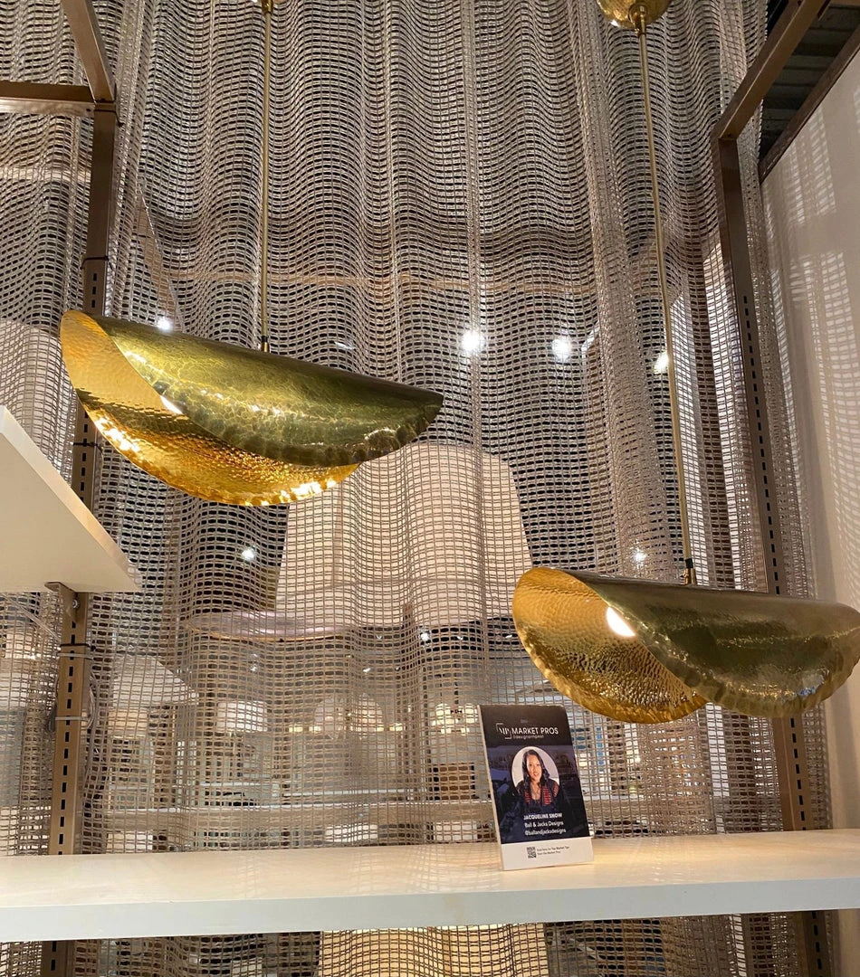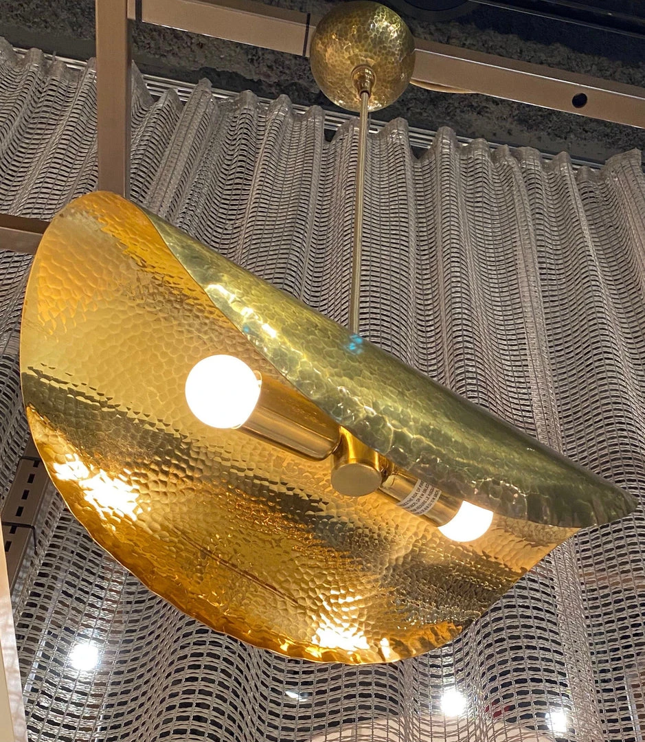 The Josue Pendant from Arteriors Home reinterprets the traditional pendant design with a unique configuration. Brass has been formed into an armor-like curve that neatly conceals two sockets. The vintage brass exterior is elevated by the polished brass interior, featuring a hammered texture. *Damp-rated, the finish will vary.