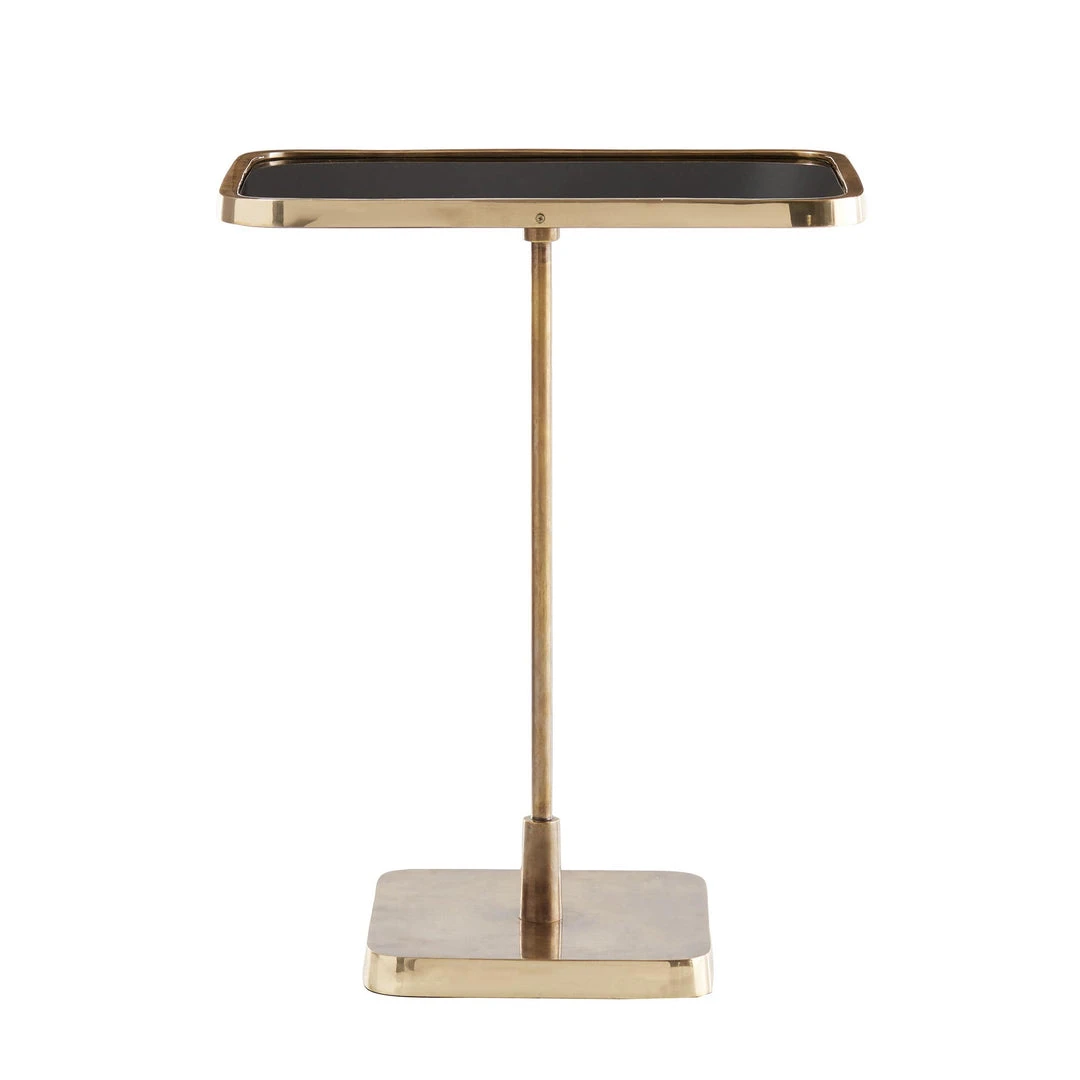 The Kaela Rectangle Accent Table from Arteriors Home offers a fresh take on geometric design. Polished brass on the base and lip contrast beautifully with the vintage brass pedestal and black mirror top.