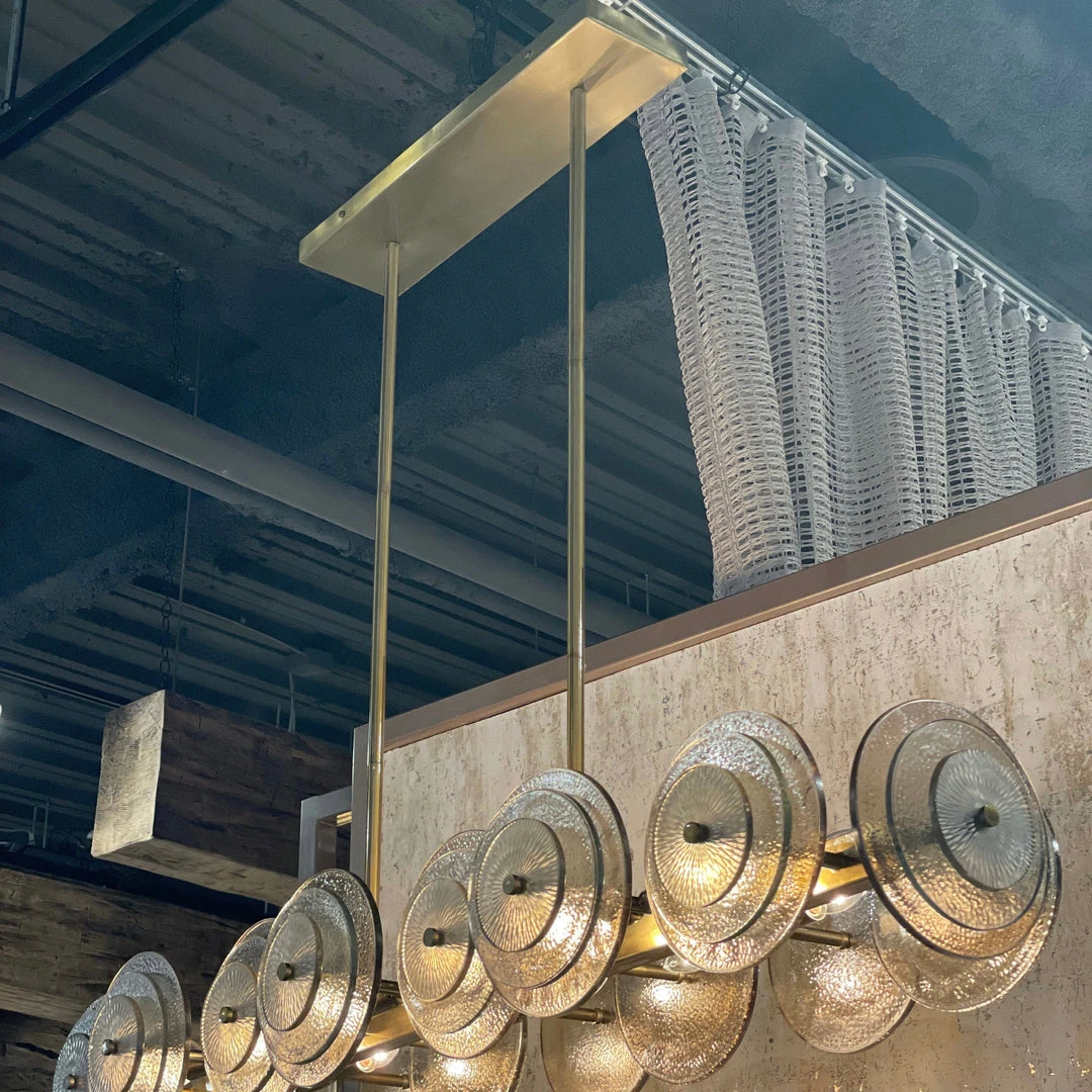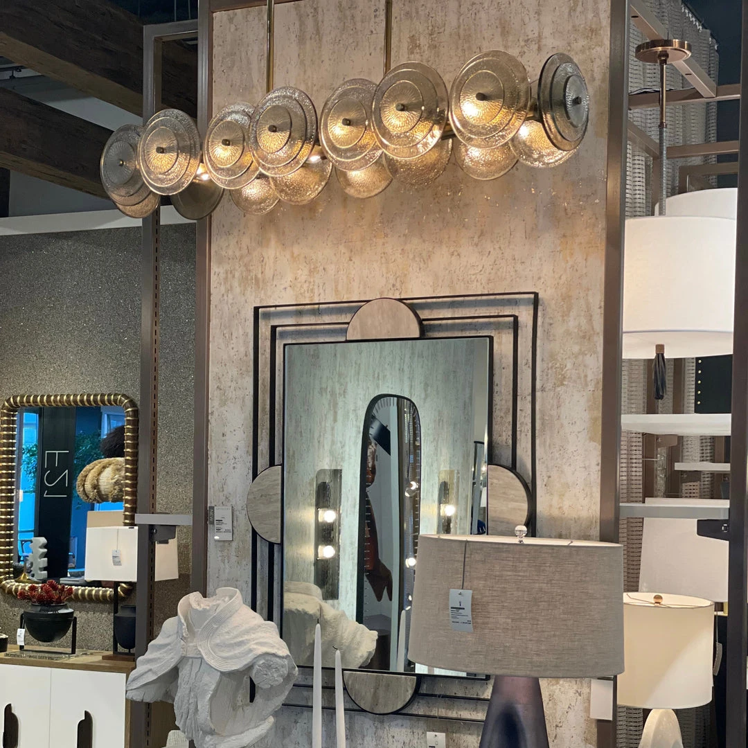 A modern take on Art Deco, the Kinlee Chandelier from Arteriors Home is composed of a series of handcrafted glass discs on a linear frame with 12 lights sparkling through the glass. A collage of clear glass, smoke glass, and smoke luster glass discs parallel an antique brass iron frame. The clear glass and smoke glass feature a hammered detail, while the smoke luster glass features an etched texture. *Finish will vary.
