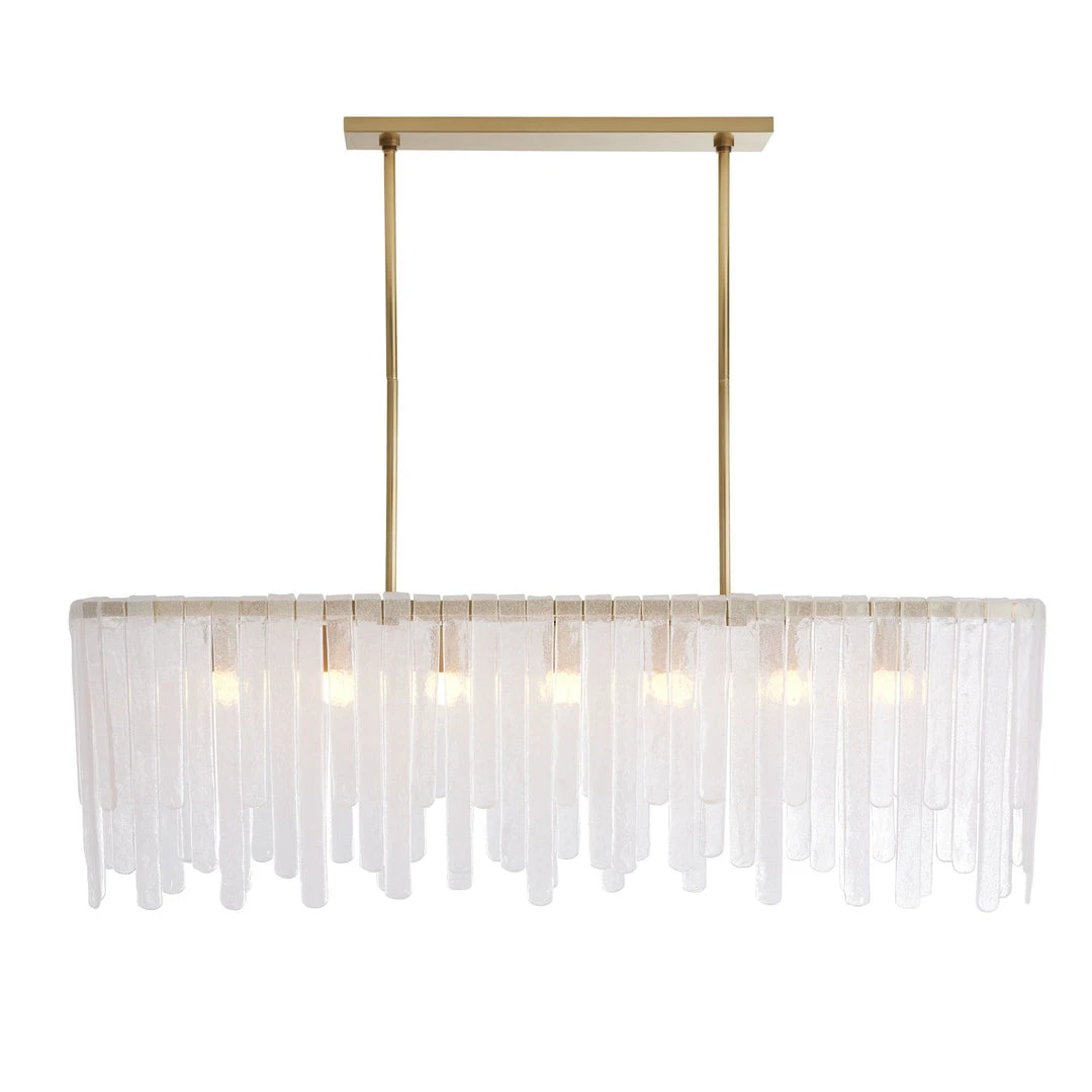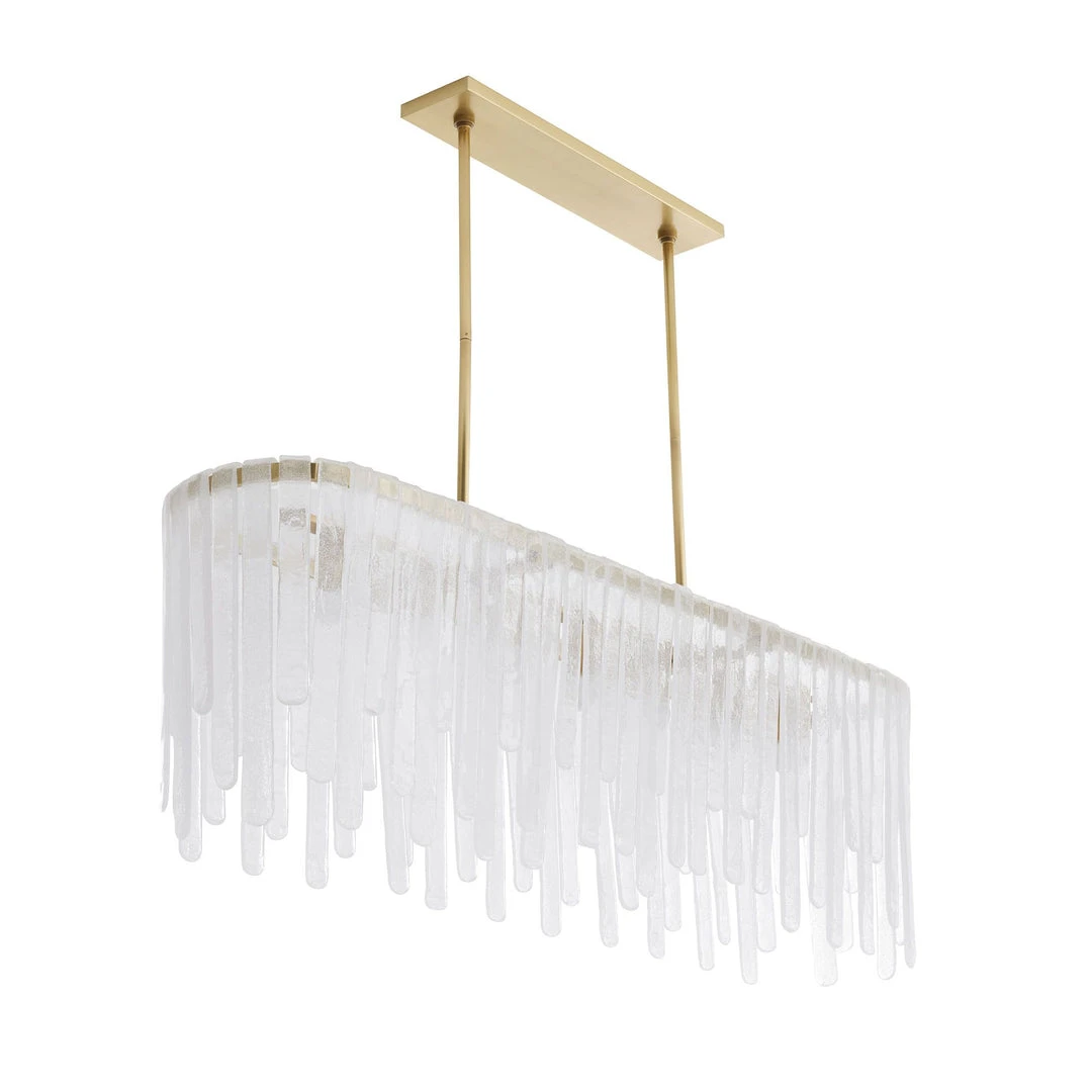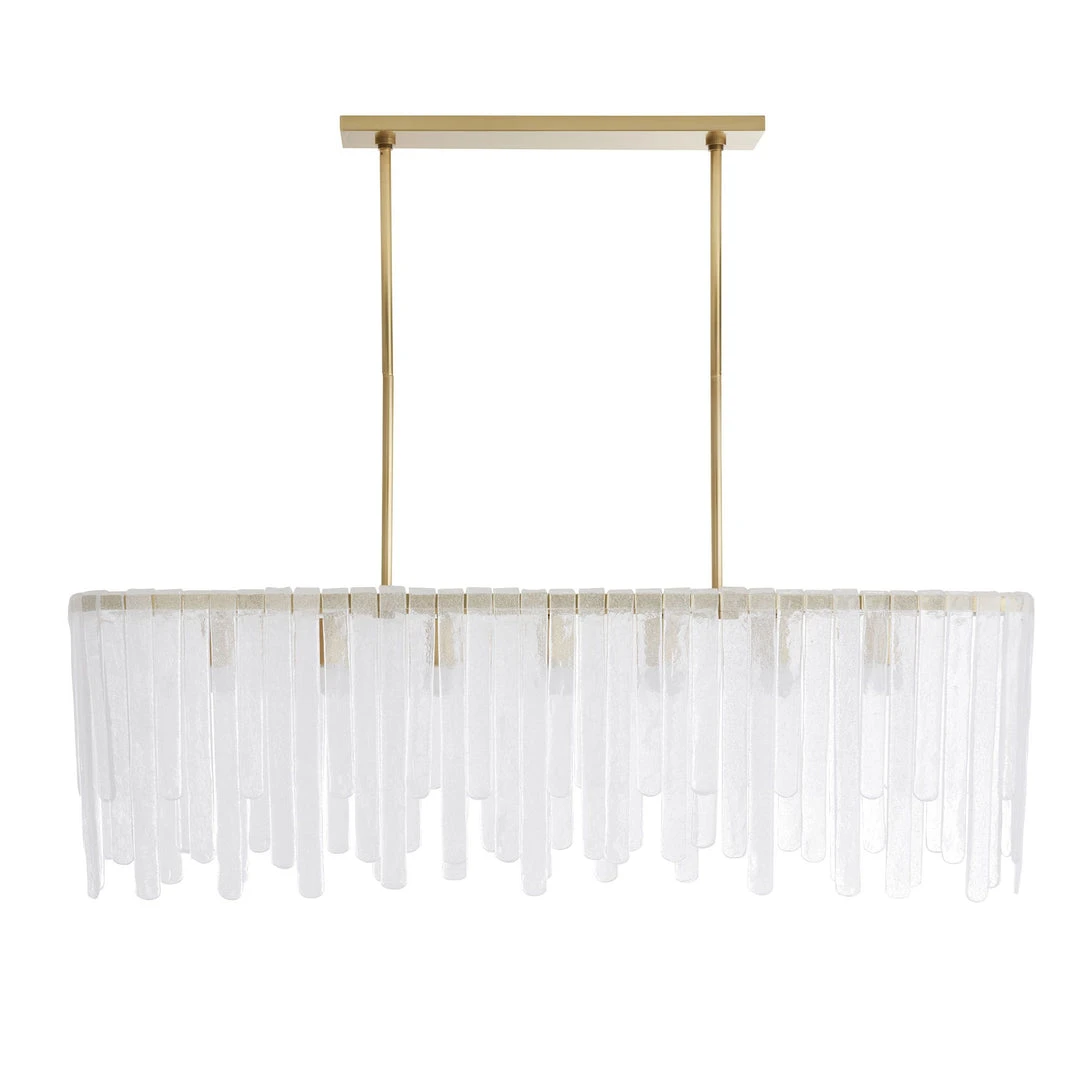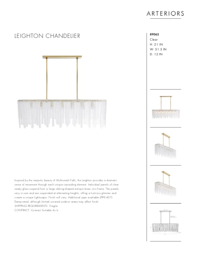 Inspired by the majestic beauty of Multnomah Falls, the Leighton Chandelier from Arteriors Home provides a dramatic sense of movement through each unique cascading element. Individual panels of clear seedy glass suspend from a large oblong-shaped antique brass iron frame. The panels vary in size and are suspended at alternating heights, offering a lustrous glimmer to your space.