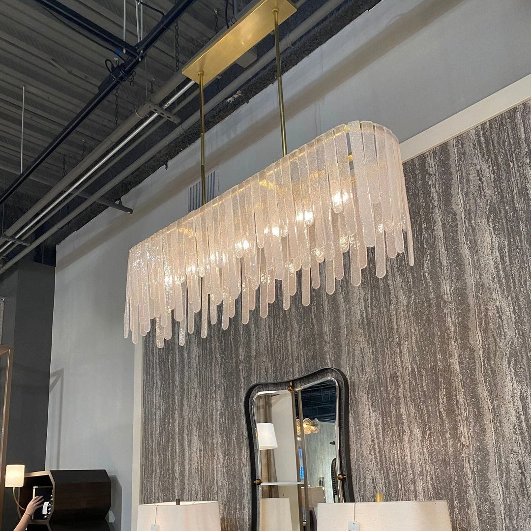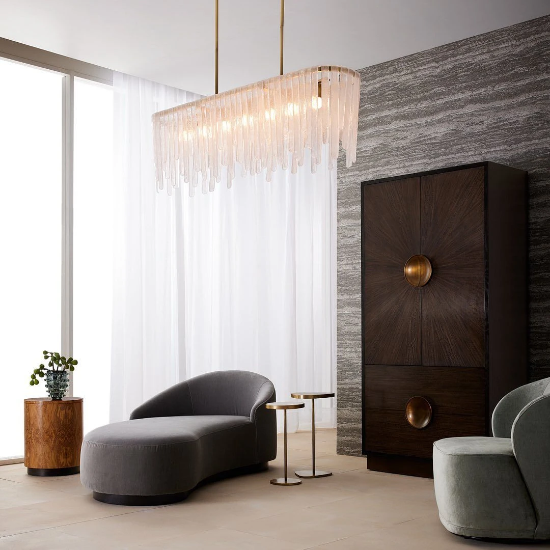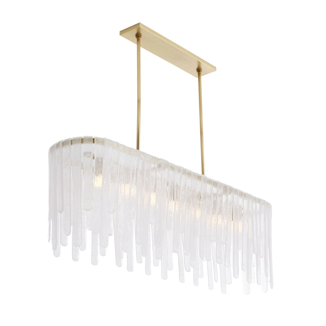Inspired by the majestic beauty of Multnomah Falls, the Leighton Chandelier from Arteriors Home provides a dramatic sense of movement through each unique cascading element. Individual panels of clear seedy glass suspend from a large oblong-shaped antique brass iron frame. The panels vary in size and are suspended at alternating heights, offering a lustrous glimmer to your space.