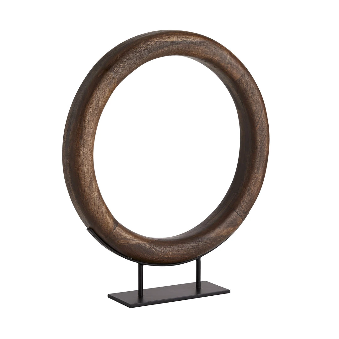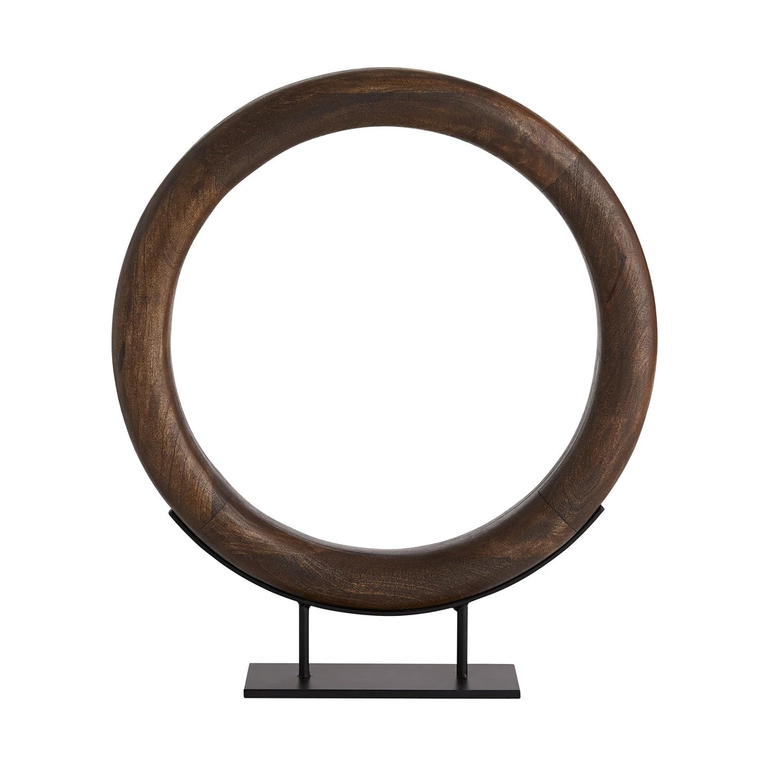 The Lesley Small Sculpture from Arteriors Home inhabits the world of sculptural design. A portal-like mango wood ring in a light walnut finish is carefully pieced together by hand, accentuating the natural grain. Artfully displayed on a black iron base, the Lesley is a monumental piece for any style setting. Pair with the larger version for an even more impressive visual.