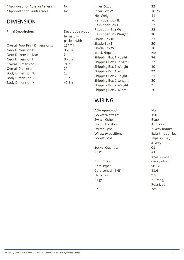 | Materials | Walnut Wood; Brown Finish; 3 Way Rotary Switch; Requires One 150watt A19 Incandescent Bulbs; 11.6' A19 Incandescent Cord; Off White Linen Shade with cotton Lining |