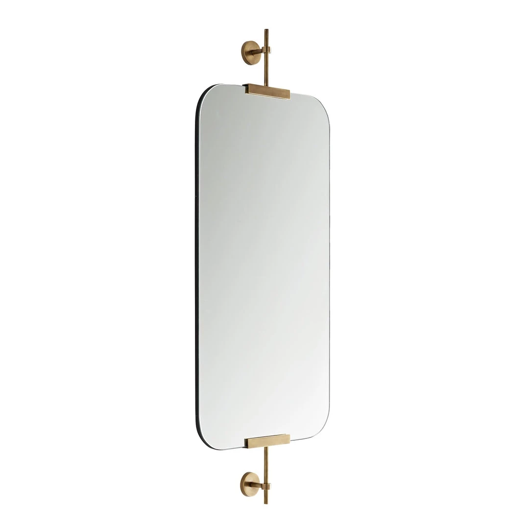The Madden Mirror in Antique Brass from Arteriors Home hovers slightly against the wall, captivating with brilliant reflection. Â Two antique brass brackets hold a plain glass mirror with round, soft edges. Â The Madden can be hung vertically or horizontally on two security cleat attachments for ultimate versatility. Place the madden in your entryway, powder room or in pairs in the master bath.
