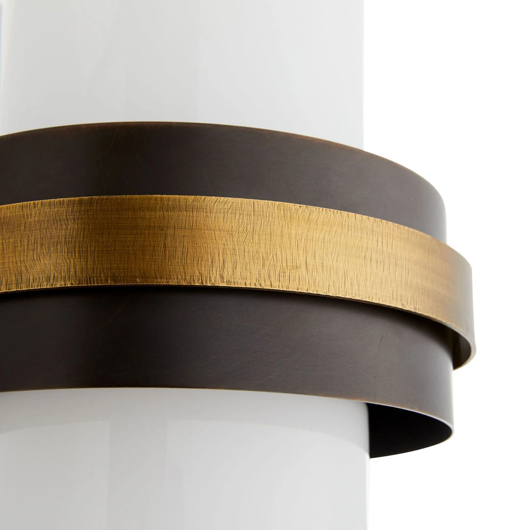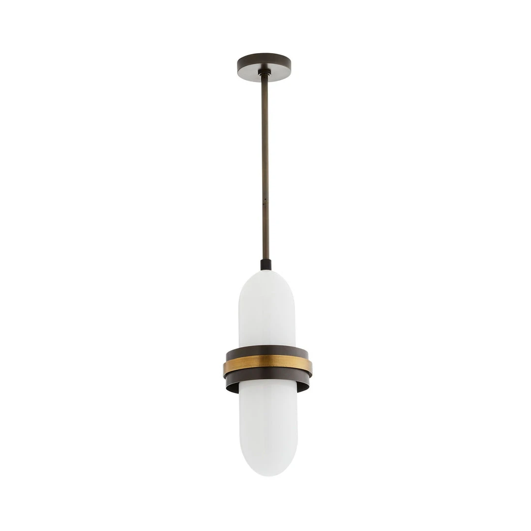 The Middlefield Pendant from Arteriors Home provides a unique take on classic forms. The capsule-shaped opal glass shade features an English bronze steel band with a center strip of chattered antique brass steel for texture. The two-tone collar circumnavigates its center, like Saturn’s rings, and gives this pendant spacial definition. LED lights offer a subtle, warm glow to the space it occupies. Additional pipe available (PIPE-488). Damp-rated, although limited covered outdoor areas may affect the finish.