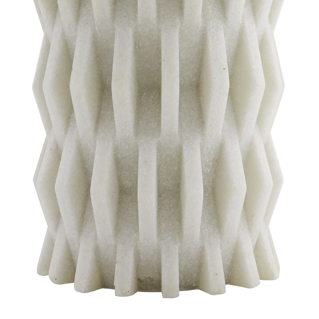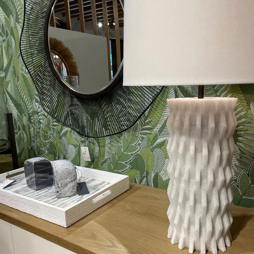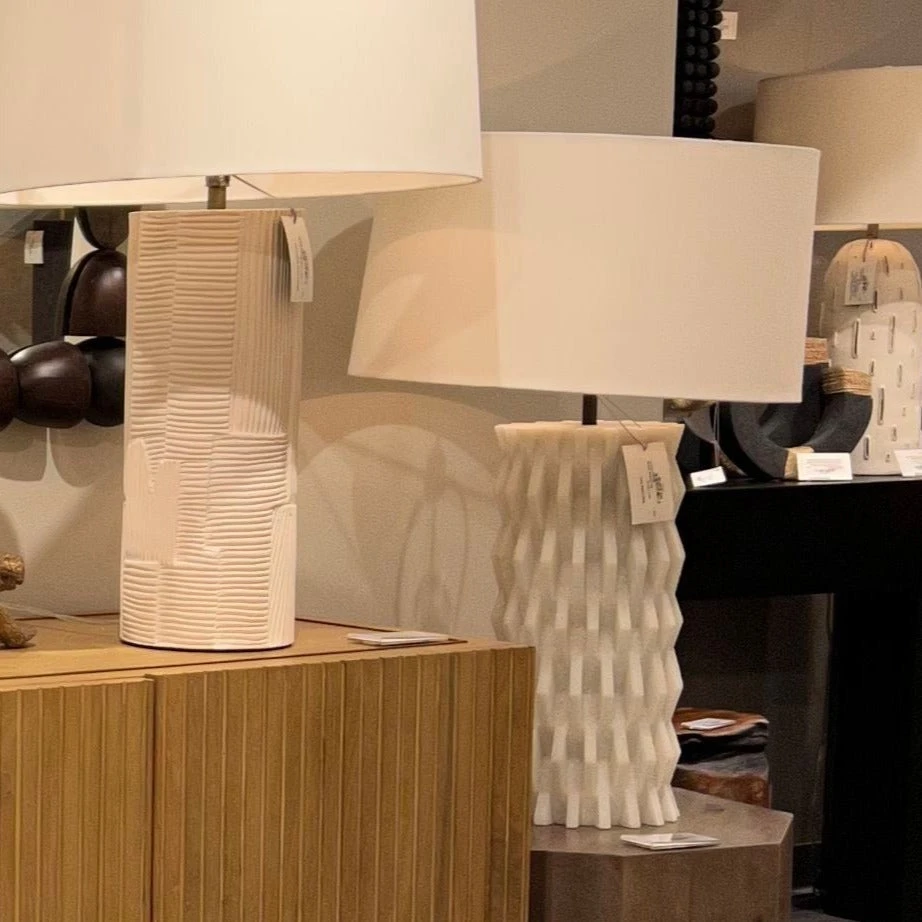 Inspired by modern Parisian architecture, the Nago’s design is full of dimensional patterns and detail. The ivory ricestone construction from Arteriors Home features a deeply tactile, zig-zag design of layered ricestone shingles. Topped with an off-white linen drum shade with off-white cotton lining and a bronze sphere finial. *Finish will vary.