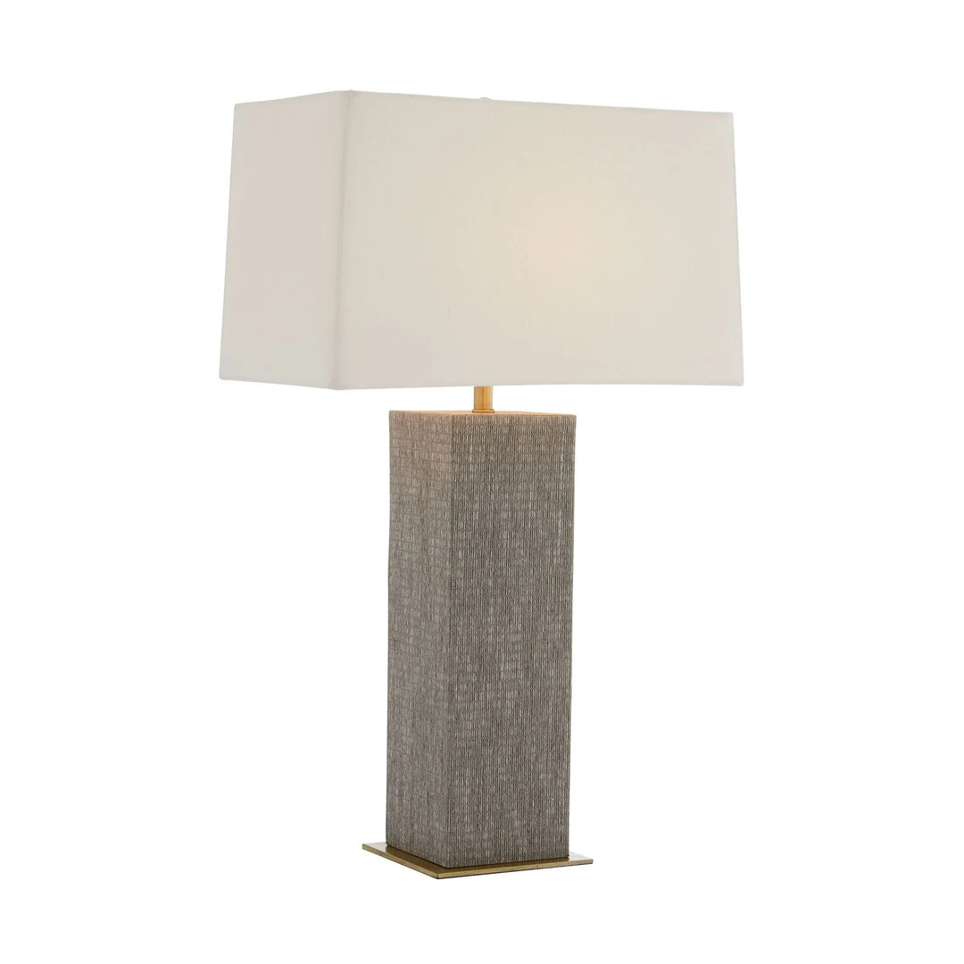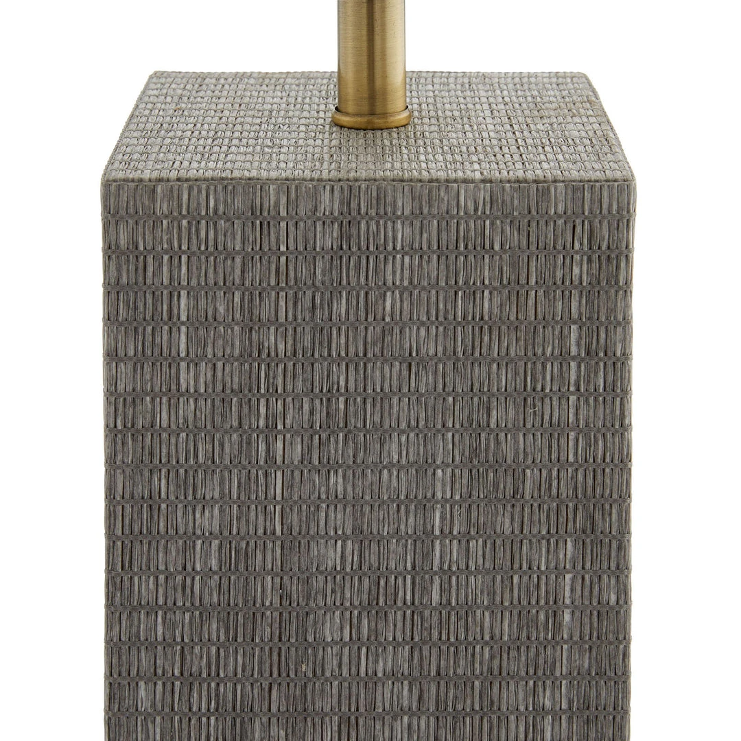 The Napa Lamp from Arteriors Home features Bauhaus style through its geometric shape and constructivist inspiration. The woven square column base features a sophisticated gray grasscloth wrap. The Napa Lamp is topped with a rectangular off-white linen shade with a white cotton lining and an antique brass sphere finial. *Finish will vary.