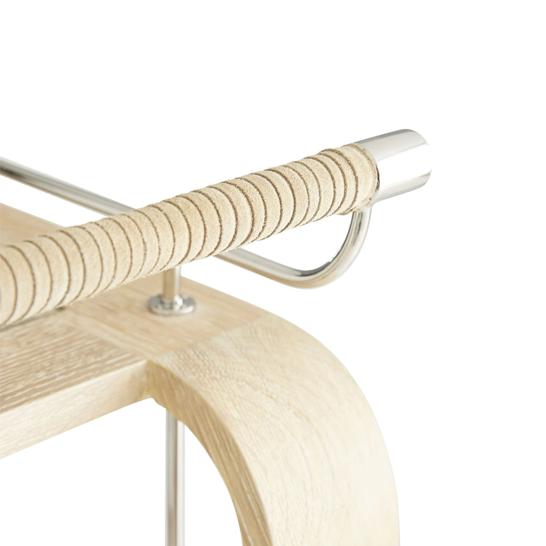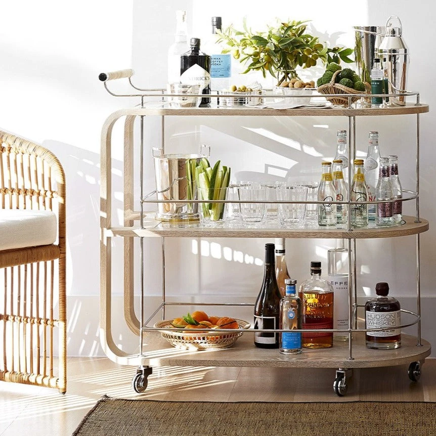 The Brays Bar Cart from Arteriors Home was inspired by a vintage one designer Beth Webb admired in the living room of the elegant New York institution, The Lowell Hotel. Made of bleached wood and a leather-wrapped handle, the bar cart looks at home in town and country. Its three tiers and refined proportions offer storage for everything a proper bar needs. The Brays Bar Cart moves nimbly across the floor, the ideal cocktail party companion.