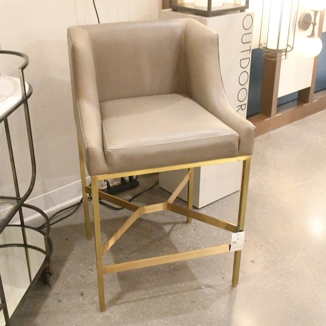 Take a seat in sophisticated style with the Dalia Bar Stool in Morel from Arteriors Home. Covered in a soft-to-the-touch morel leather, this stool features a squared back profile with slightly curved arms that gracefully flow into an antique brass linear base. Its shortened arm height allows it to easily slide under counters. Its versatile aesthetic complements both traditional and modern decor, making it an optimal seating option for various settings. *Finish and leather may vary.