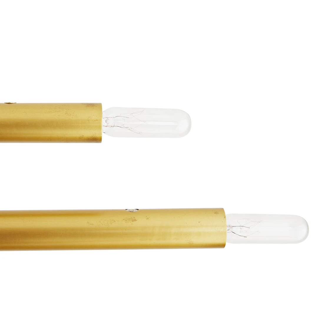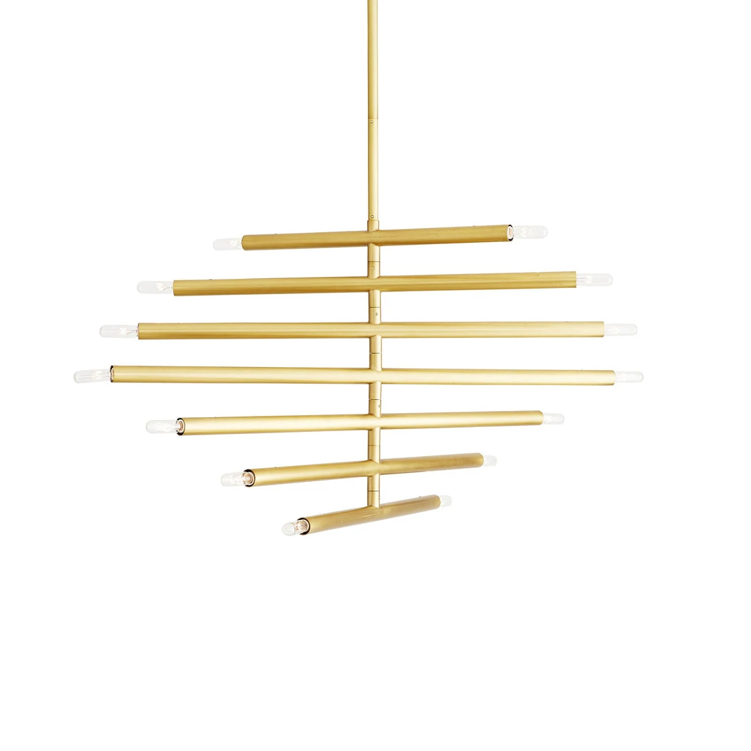 Architectural in design by any standard, the Dean Chandelier from Arteriors Home delivers chic, contemporary style to your home. This striking light features an antique brass steel frame that presents piped arms in various lengths that extend from a single sleek structure—each showcasing two globe bulbs. Inspired by kinetic sculptures, the multi-tiered arms of this luxe luminaire rotate so you can alternate their position or keep them stationary. *Additional pipe available (PIPE-442). *Damp-rated, although limited covered outdoor conditions may affect the finish.