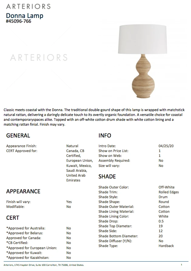 Classic meets coastal with the Donna Lamp from Arteriors Home. The traditional double-gourd shape of this lamp is wrapped with matchstick natural rattan, delivering a daringly delicate touch to its overtly organic foundation. A versatile choice for coastal and contemporary spaces alike. Topped with an off-white cotton drum shade with white cotton lining and a matching rattan finial. *Finish may vary