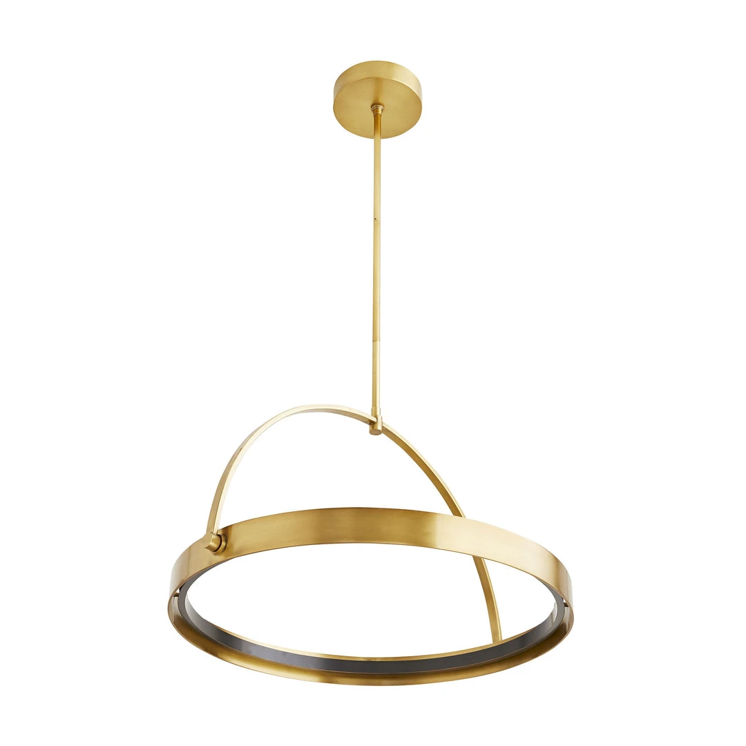 The Fisk Pendant in Antique Brass from Arteriors Home presents design elements that are minimal and modern. Though its foundation may seem simple, it’s anything but. The circular, open-form steel antique brass structure features an LED ring that pivots from lying flat within the frame to almost vertical—a unique feature that allows you to set the scene from sleek and straightforward to daring and dramatic. *Additional pipe available (PIPE-442). **Damp-rated, although limited covered outdoor conditions may affect the finish.
