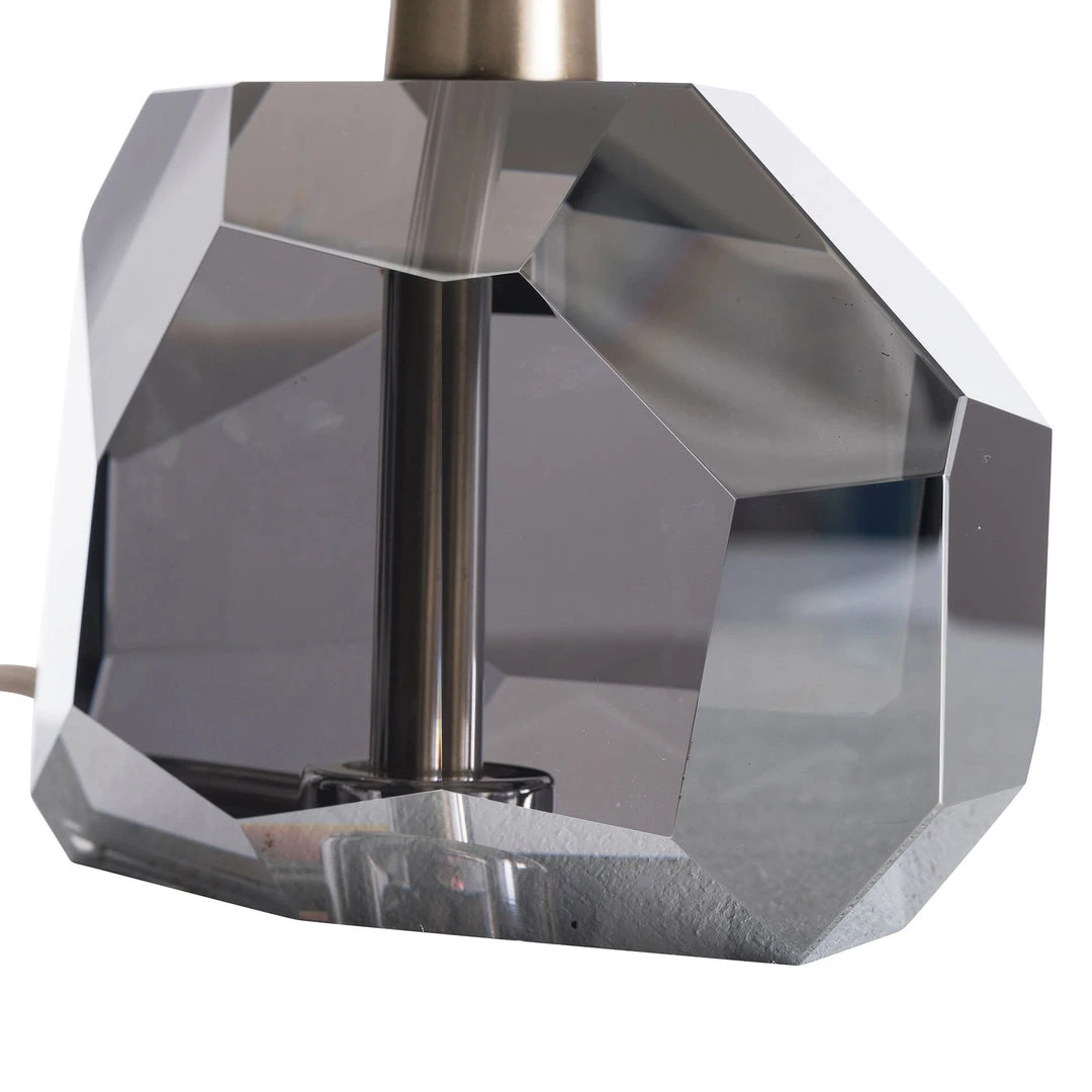 Become mesmerized by the crystal base of the Gemma Lamp by Arteriors Home. Â The organic formation of the fixture, along with the smoke color, give it a high end glamorous vibe. Â The center of the light features pale brass hardware topped with a cloud gray microfiber shade, finished off with a pale brass finial.