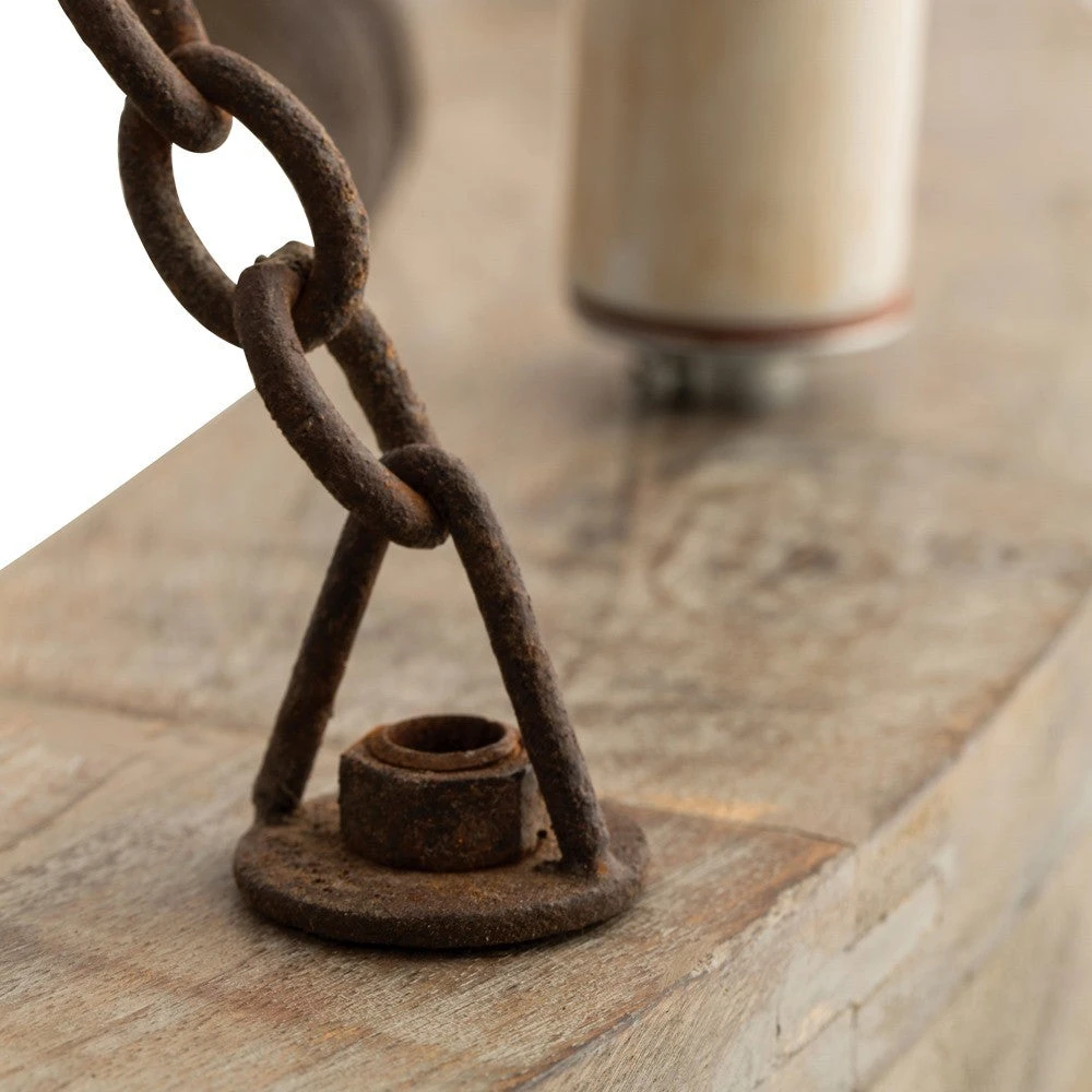 The Arteriors Home Geoffrey Medium Chandelier features a ring of natural wood with 12 lights, suspended by a purposely rusted chain. Modern rustic chandeliers like the Geoffrey make a dynamic statement hanging over a dining table or kitchen island. Arteriors Home used antique Edison bulbs in the photograph to reinforce the ambiance of this hanging light fixture.
