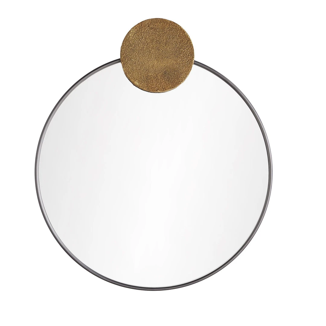 Equal parts masculine and feminine, the Greenwich Mirror from Arteriors Home is simple in form and sophisticated in style. Inspired by the forged craftsmanship of some of our favorite jewelry pieces, the sleek bronze iron frame is adorned with an aluminum antique brass medallion with a textured façade for dramatic contrast. A subtle statement piece for modern and traditional spaces. Security cleat allows for vertical or horizontal display. *Finish will vary.