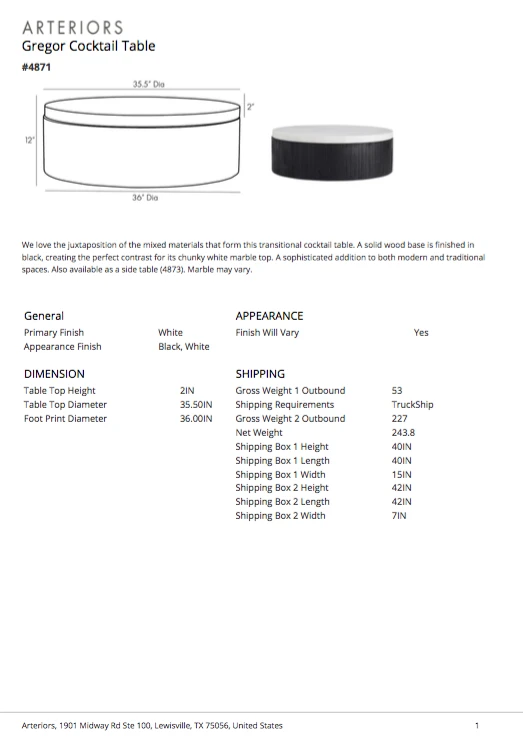 SKU: arteriors-home-6576814653488 Categories: Arteriors, Arteriors Home, Brands, Coffee Table, Furniture, New, New Arrivals, Tables Tags: Apr2021, Arteriors, Arteriors coffee table, Arteriors home, Arteriors home furniture, Gregor, Marble coffee table cocktail table, Round coffee table