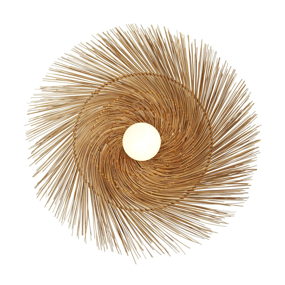 Bearing a beautiful, organic structure, the Hayes Sconce from Arteriors Home establishes a strong presence while remaining light and airy. The skirted form is crafted from a natural buri midrib that is woven to appear in a constant state of motion, whirling around the antique brass steel frame. Its versatile design allows this fixture to function as a sconce or a flush mount. A natural choice for illuminating small spaces. *Finish will vary.
