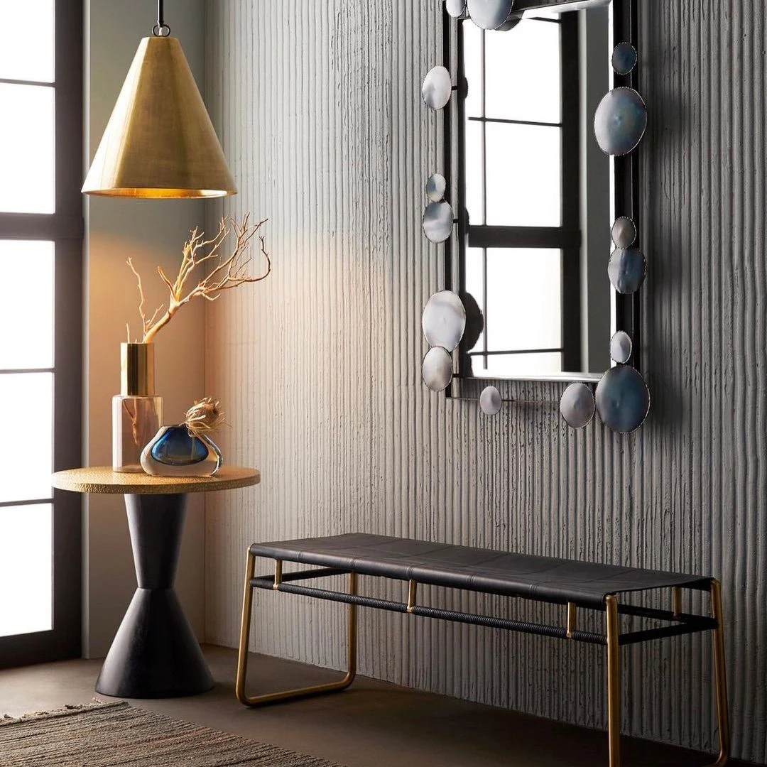 The classic conical-shaped Helga Pendant from Arteriors Home is a modern mainstay with timeless appeal. Its sleek and slender foundation is composed of iron, with an antique brass finish on the shade and a bronze finish on the pipe for a subtle contrast. A forged iron ring detail ties the two finishes together and creates overall cohesiveness. Perfect for spotlighting your favorite setting. The finish will vary. Additional pipe available (PIPE-462). Damp-rated, though limited outdoor conditions may affect the finish.