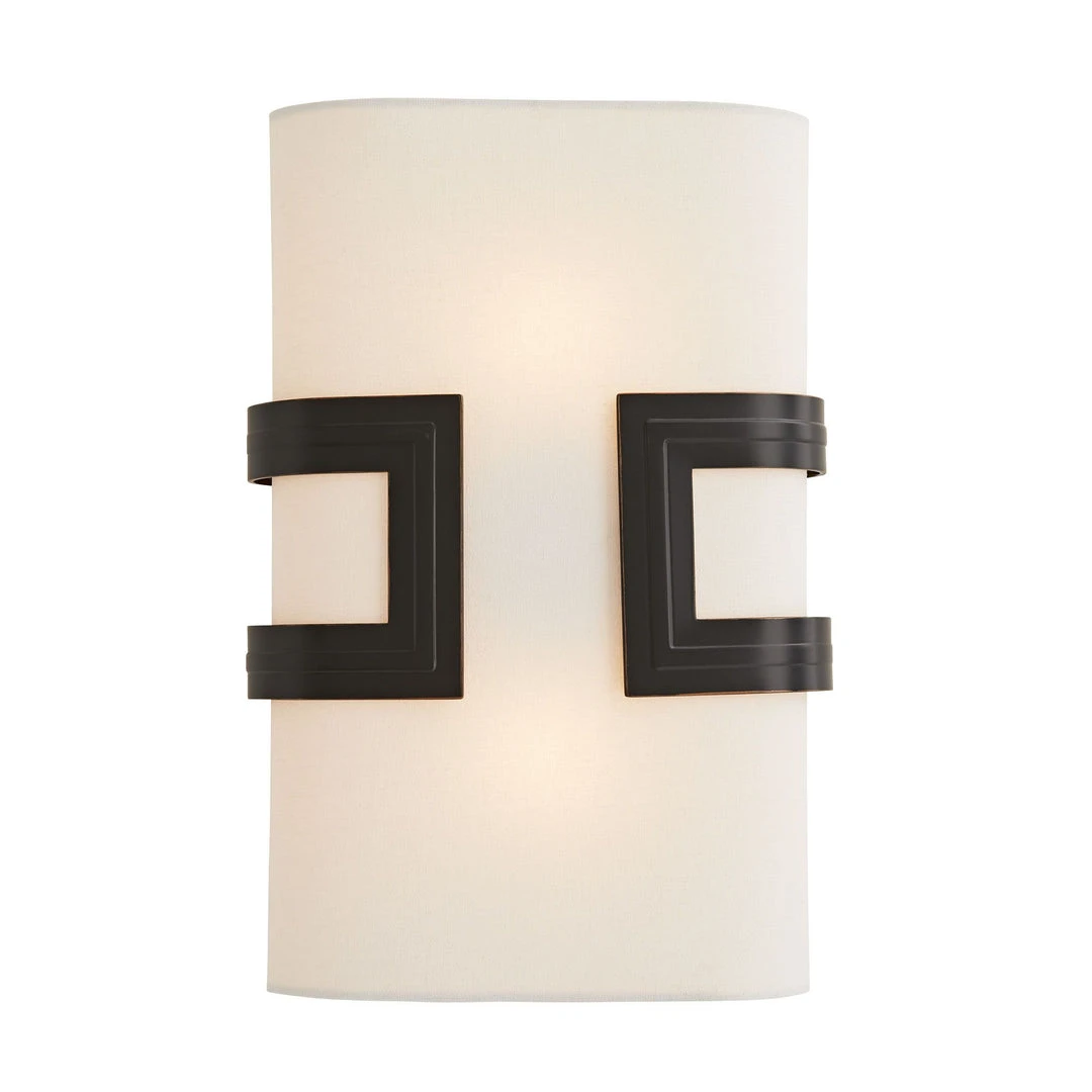 Classic yet contemporary, the Hewett Sconce in Bronze from Arteriors Home is a statement piece for any wall space. A white linen shade showcases a shallow profile, which is artfully cuffed by bronze steel brackets. The open-form belted center gives this piece dimension and allows the shade to be incorporated into the structure. With two bulbs, this striking fixture provides ample light to a room. *Damp Rated, though limited outdoor conditions may affect the finish.
