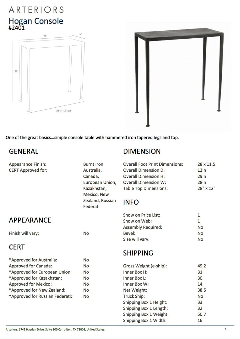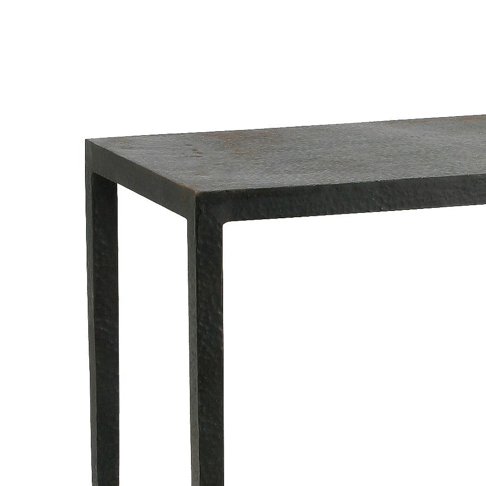 One of the great basics, the Hogan Console from Arteriors Home offers stylish simplicity with hammered iron tapered legs and top. The Hogan is crafted from solid iron that has been hammered by hand, lending a textured touch to its industrial frame. An ultra-thin top blends into slightly tapered legs that appear delicate but are extremely steady. Visually lightweight, it offers an airy aesthetic to entryways, living spaces or offices.