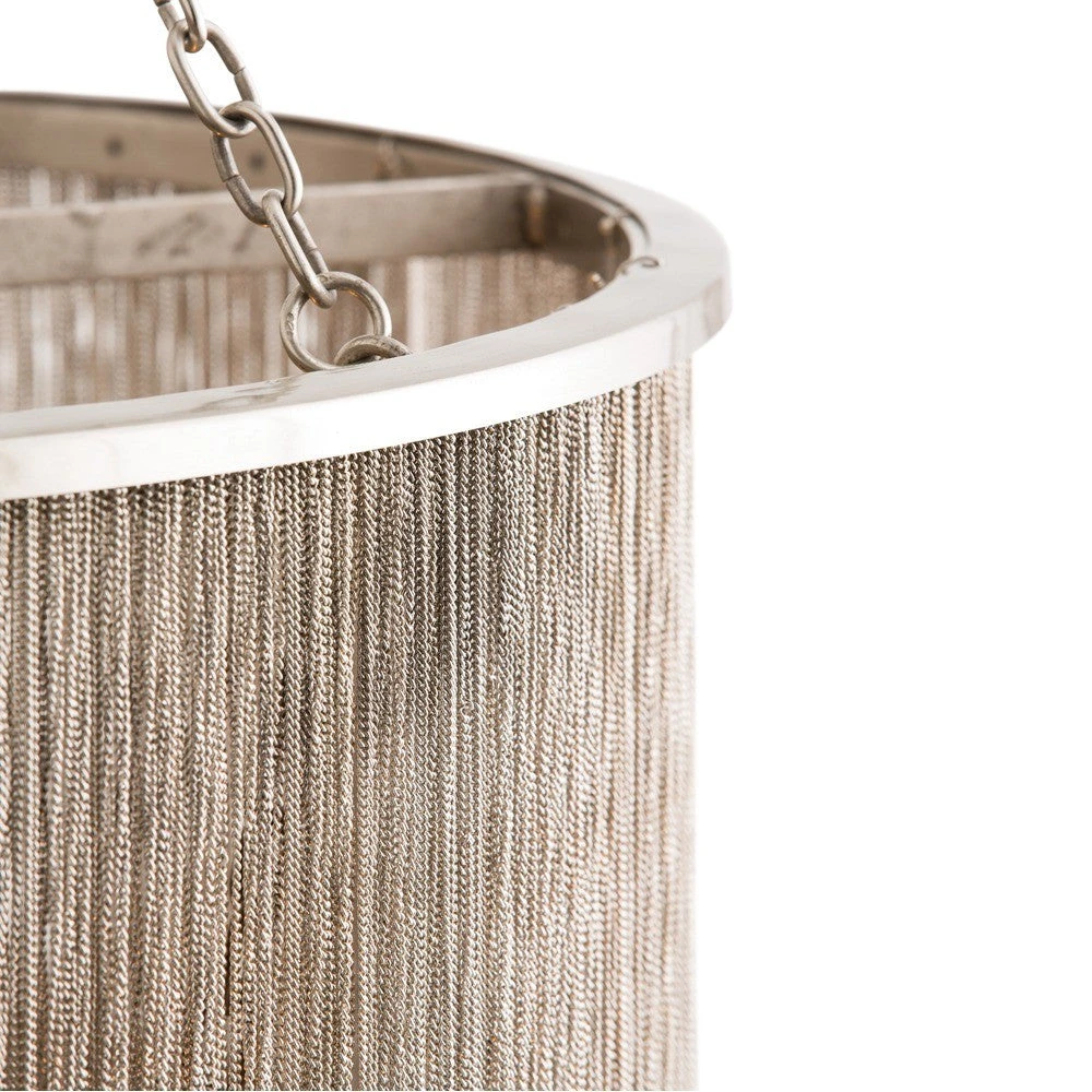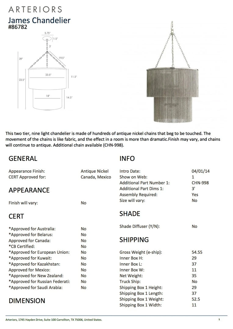 The Arteriors Home James Chandelier, a two tier, nine light chandelier, is made of hundreds of antique nickel chains that beg to be touched. The movement of the chains on this light fixture are like fabric, and the effect of the James Chandelier by Arteriors Home in a room is more than dramatic. *Finish may vary, and chains will continue to antique.