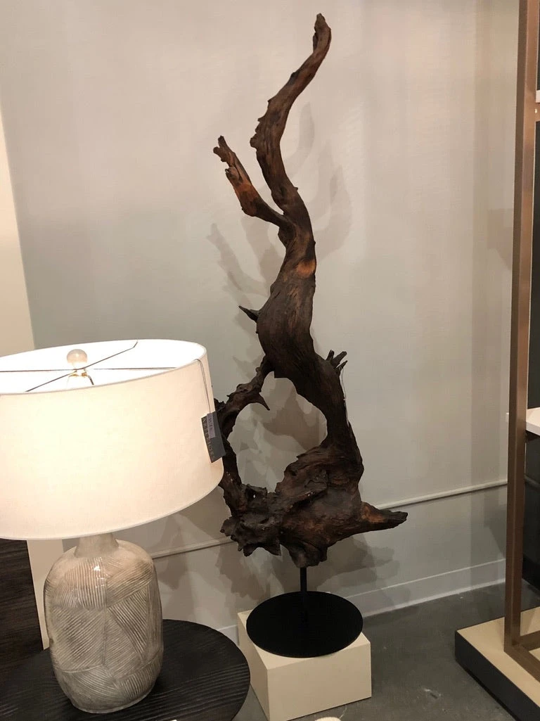 The Kazu Floor Sculpture from Arteriors Home features a large-scale natural tree root sculpture on an iron base, delivering a dramatic visual design focal point. Place this striking floor sculpture for a dramatic point of interest *Due to the organic nature, size may vary up to 10″ height and width.